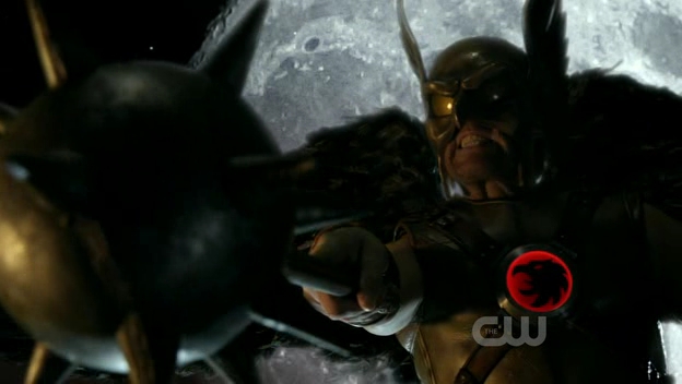 At Watchtower, Chloe is trying to contact Green Arrow when he comes crashing through the window. The winged figure then appears at the window and says to stay out of their business, before flying away.