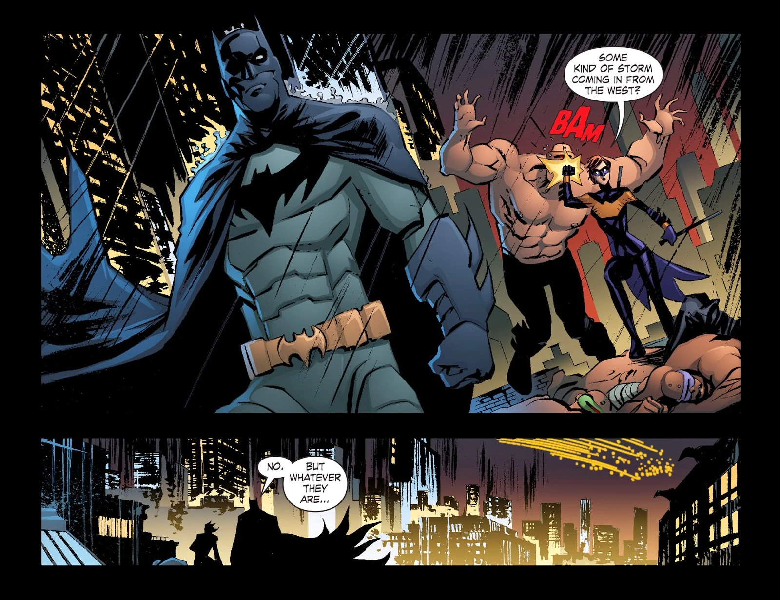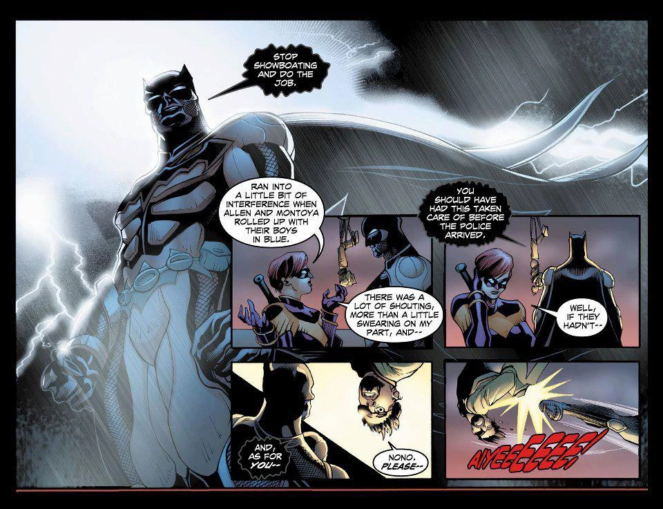 One stormy night in Gotham, Batman intercepts a minor weapons dealer meeting convening in the alley. Watching from the shadows Batman observes as the meeting is disrupted by his protégé Nightwing. While Nightwing deals with the goons present. Batman focuses his attention on Saul the gun-runner who's been transporting these hi-tech weapons on the behalf of Intergang to gangs around various cities featuring Heroes. Descending from his location Batman swings down and grabs Saul bringing him ten stories up high above the alley suspending him upside down attached to a grappling line crane. Batman is later joined by Nightwing whom he reprimand her for showboating in her approach with dealing with the goons prior to the arrival of the police who caused interference.