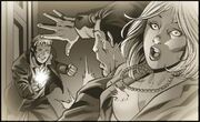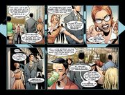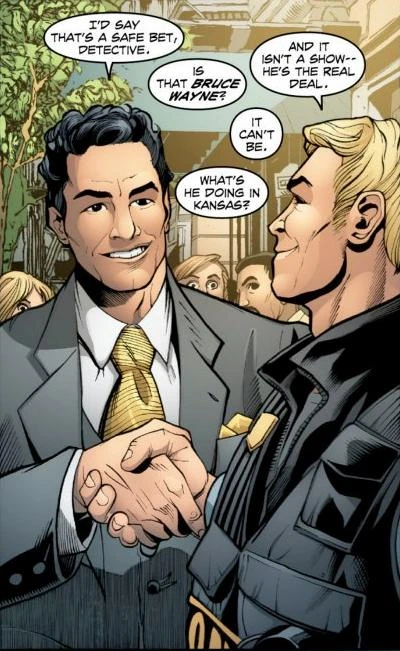 Superman has just rounded up a group of armored-tech thugs for holding hostage a school bus filled with children. Superman hands these criminals off to the Metropolis police department lead by Detective Dan Turpin before flying off. Dan instantly recognizes Bruce and welcomes him to Metropolis before he summoned away by his partner Maggie Sawyer. Bruce is then left with Barbara who then display a fan-girlish appreciation for Superman much to Bruce's annoyance. However Bruce doesn't let it bother him, instead he counteracts it by addressing a fact he observed which is that Superman is already involved in a relationship with a woman. Barbara realized that Bruce was "showing off" his Detective skills thereby ending the subject discussion.
