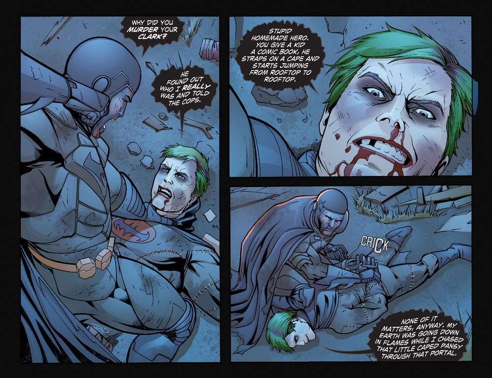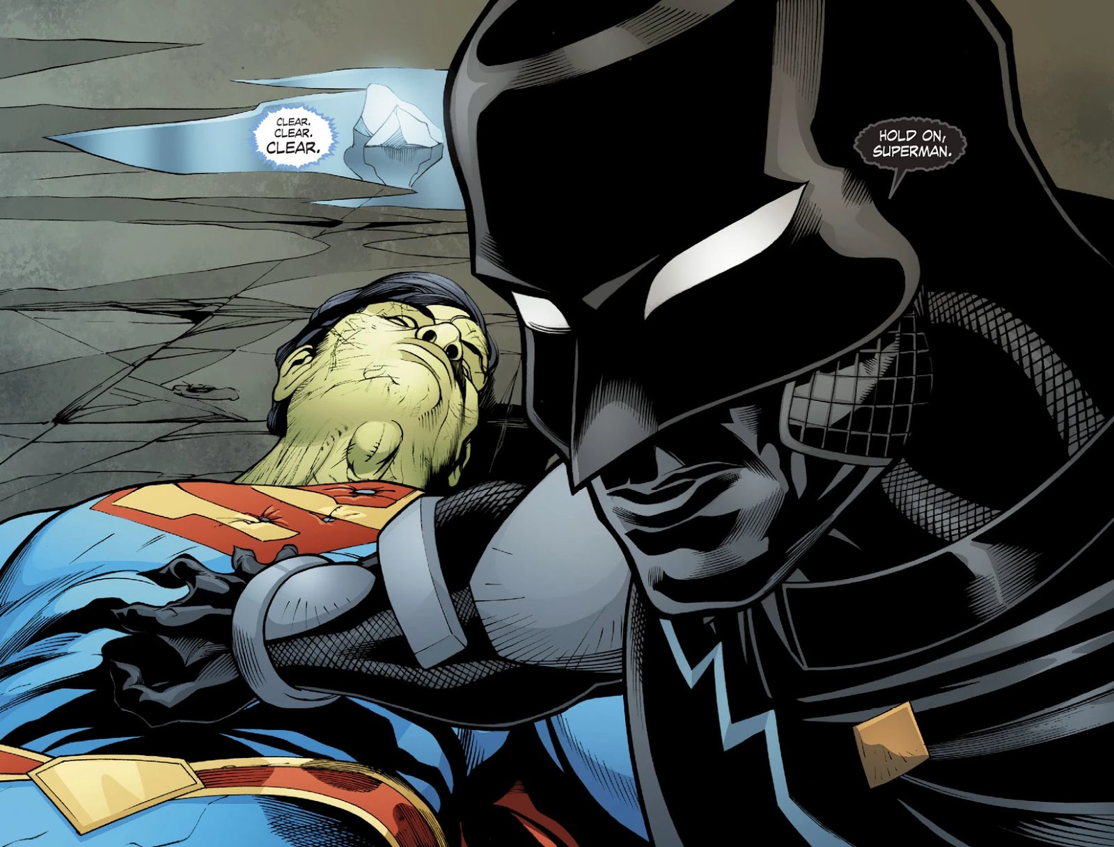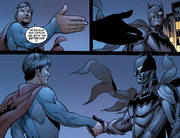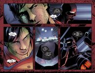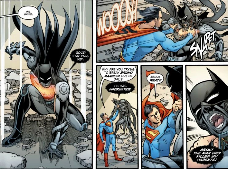 Impressed Batman complements him, Superman grabs a hold of Batman crushing the device on his emblem and interrogates him on why he tried to free Bruno Mannheim. Batman informs him that Mannheim has intel to find the man who murdered his parents. Superman is shocked and puts Batman down.