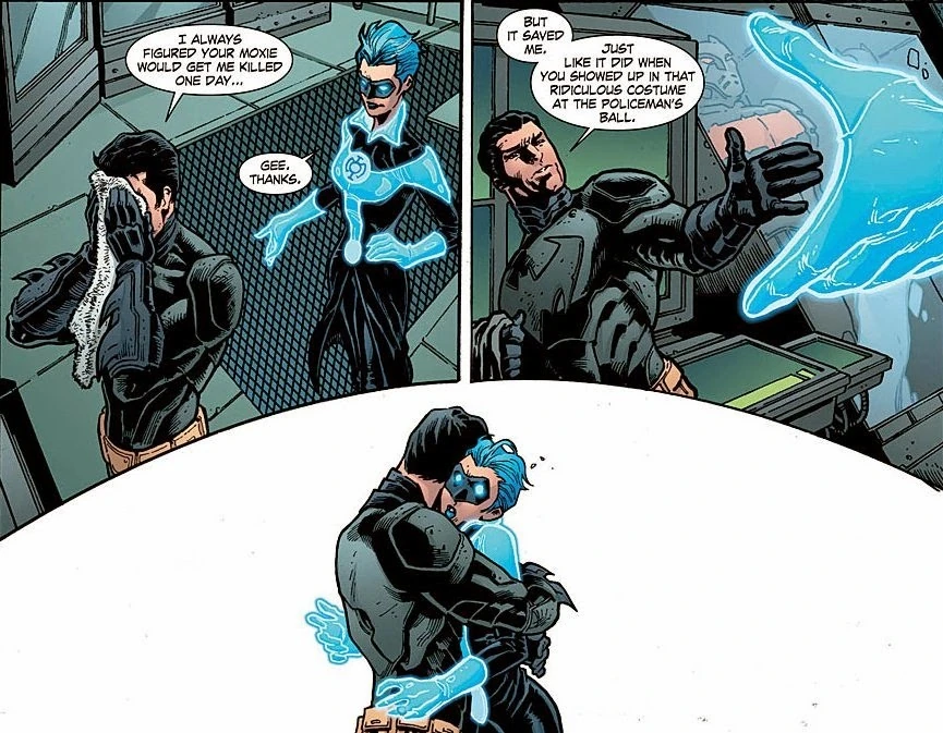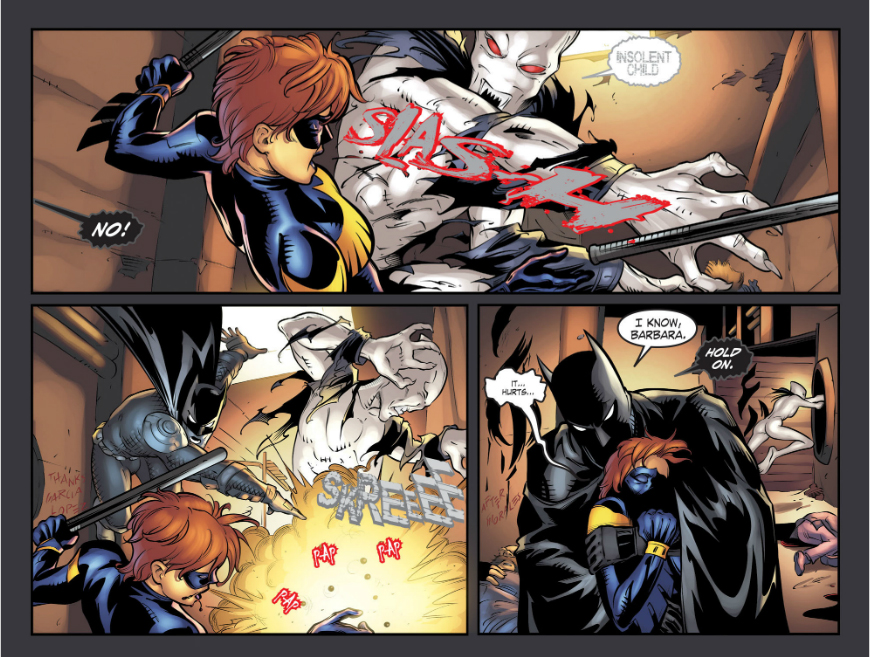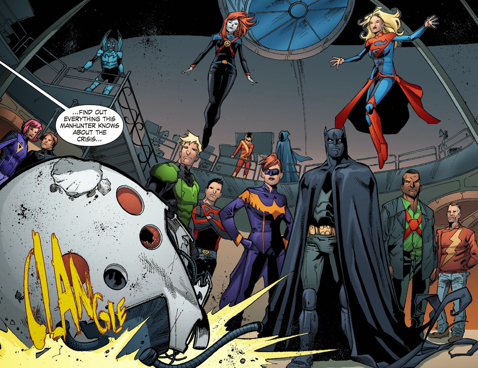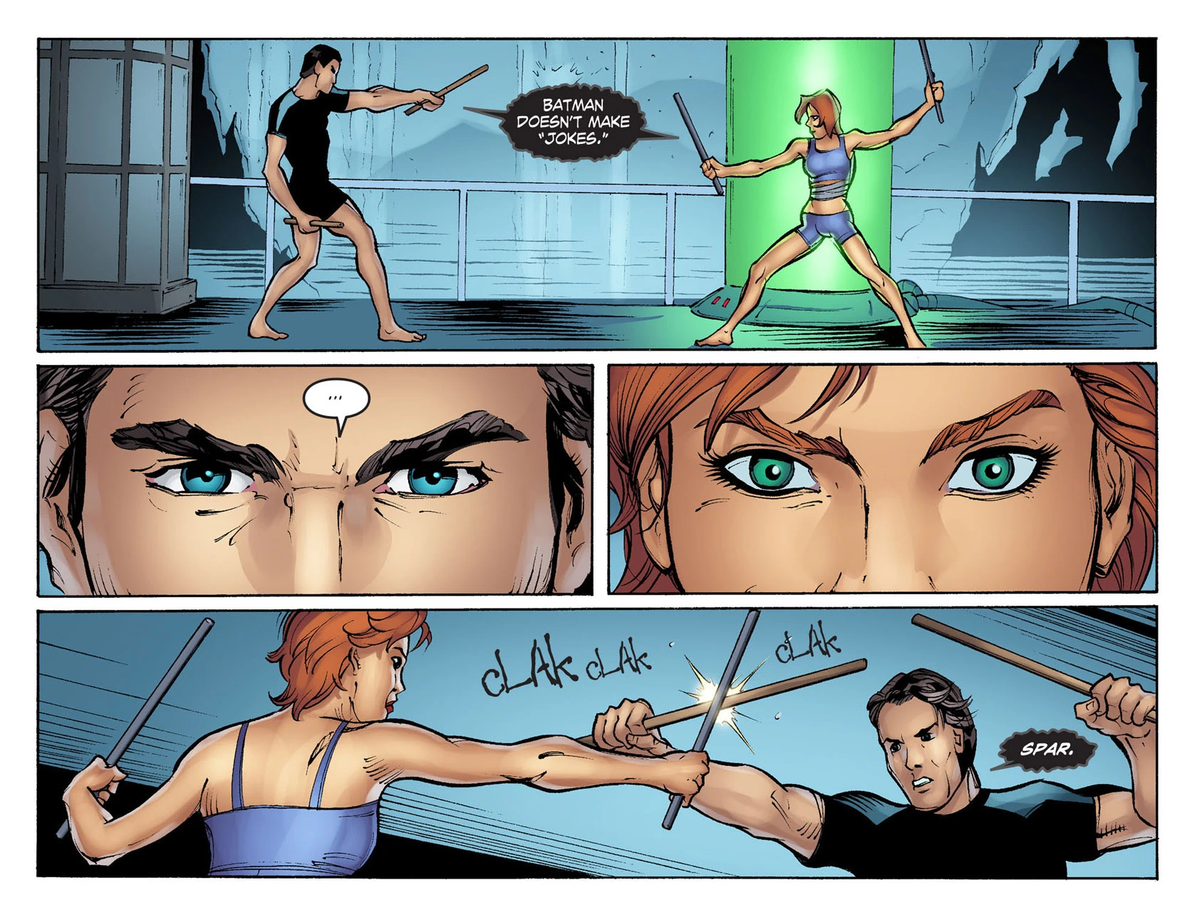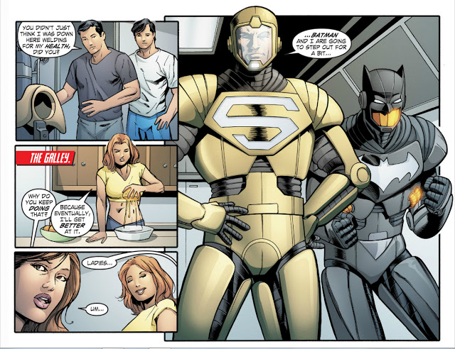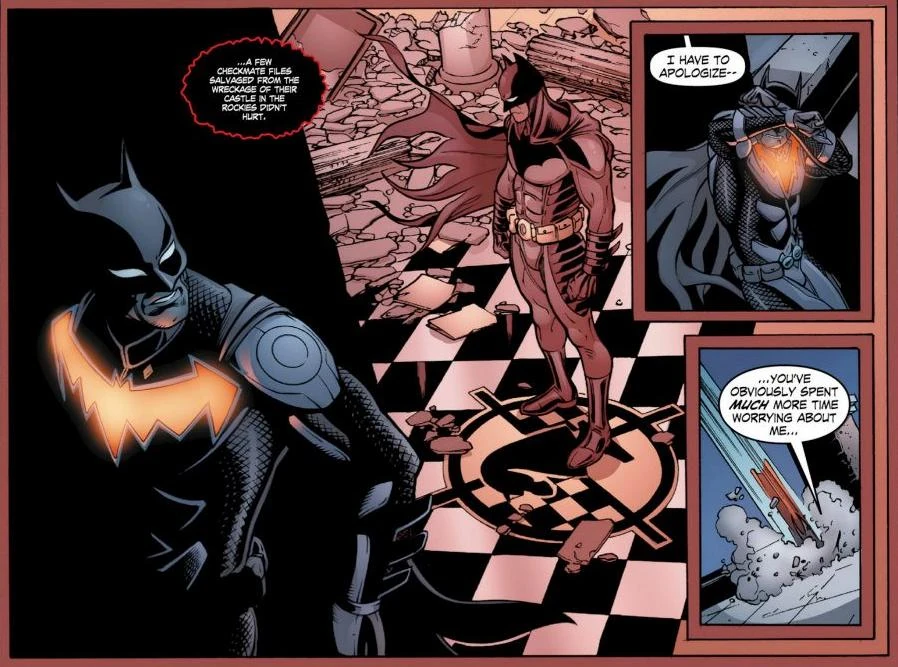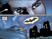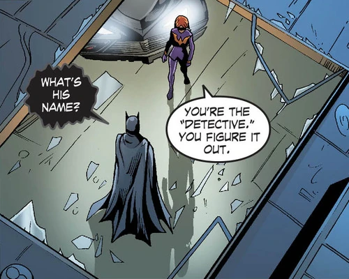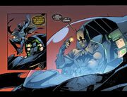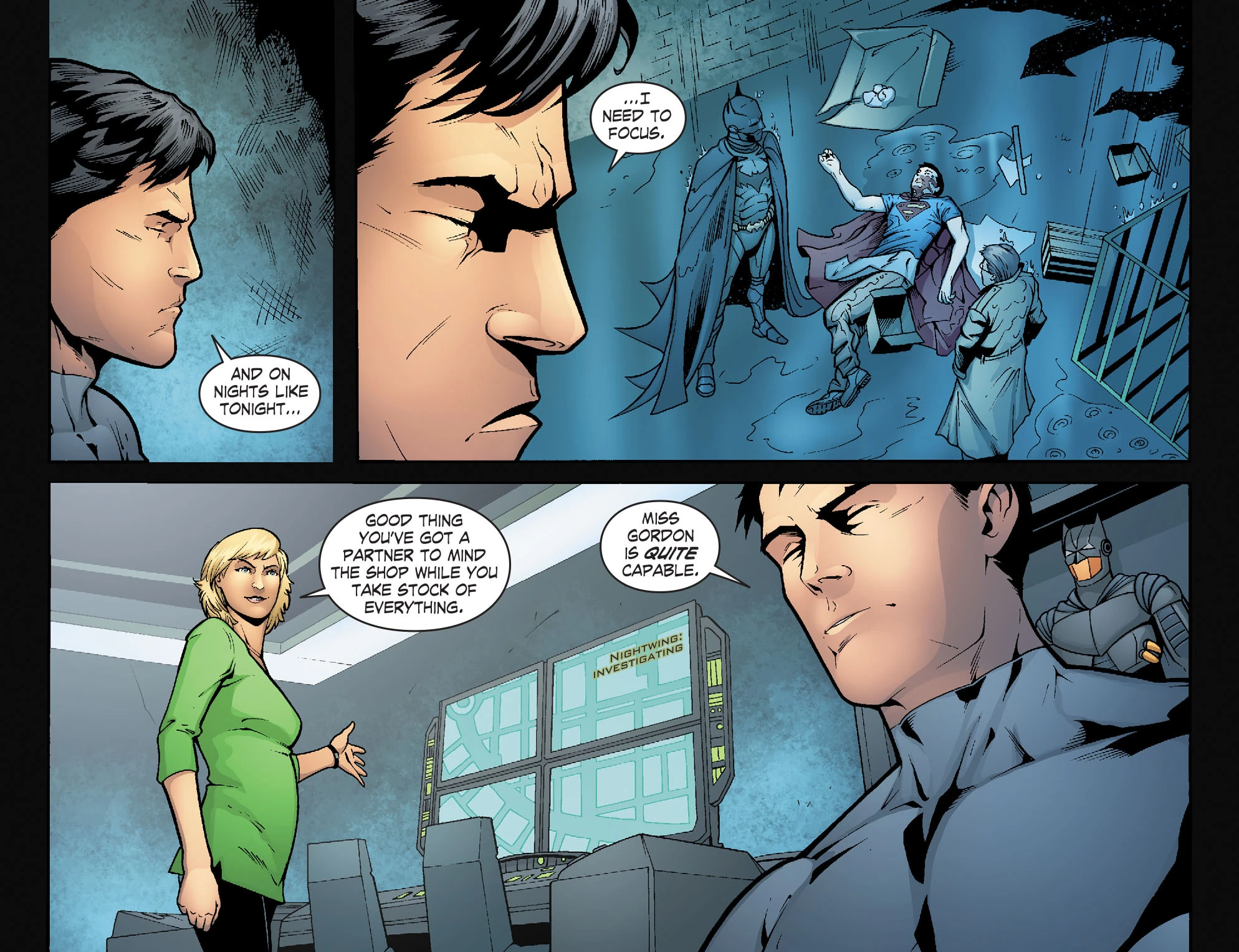 At a supply ship called Leviathan docked in Metropolis is an HQ for Batman and Nightwing, where inside they are getting medical treatment. Bruce mentions his woman at Interpol liaising with the FBI and has found Chill's location: Suicide Slums. Barb jokes about how Superman figured out who Batman was and Bruce jokes about maybe she could be Superman's Supergirl. Barb points out how she'll hate it like she hated the name "Batgirl", as well as the fact that Superman has or had a Supergirl. The cameras pick up something and Bruce decides to head out alone, while Barb is in the Hub, when he looks outside to see what it is: the Bat-Signal.