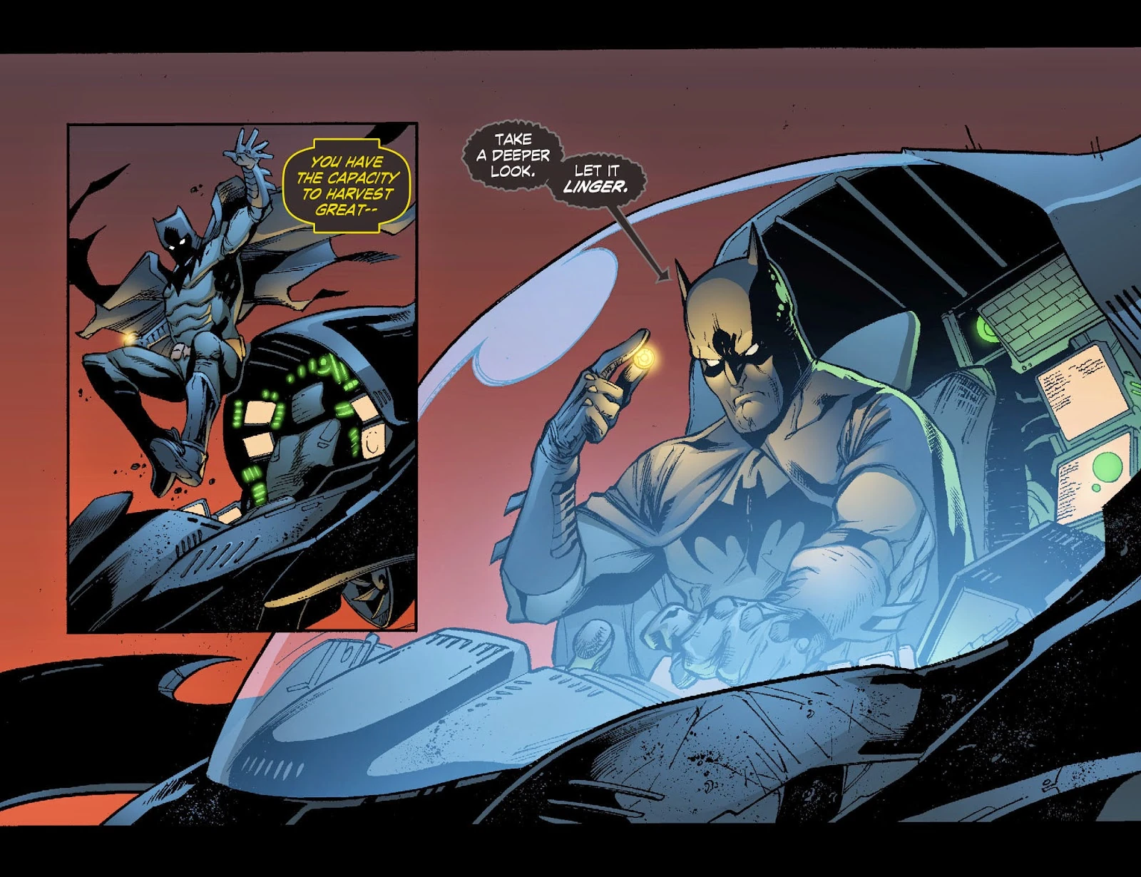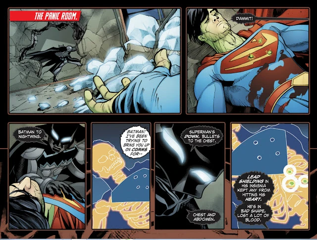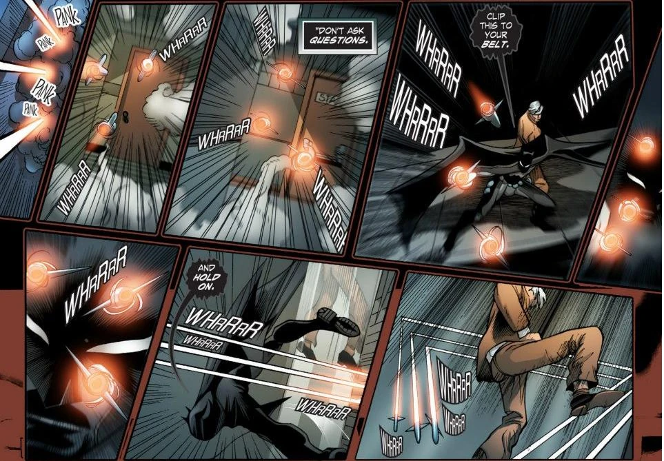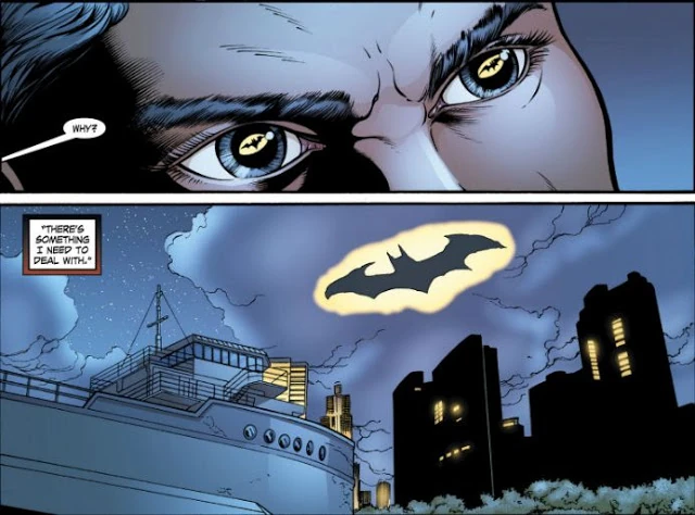 Batman returns to interrogating Saul to learn who the boss is behind the shipment. Saul frightfully gives up the name of Joe Chill. For a brief moment Batman recount the horrific moment from his past as a child that changed his life forever. Nightwing notices the effect the name has on Batman and attempts to learn the significant behind it. But Batman merely says to Nightwing to go back to the cave because they are heading to Metropolis.