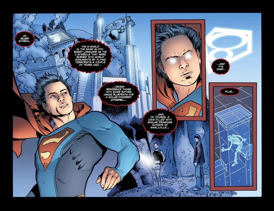 Batman begins to explain to Superman that he's figured out that Superman isn't human and in fact an alien. He also points out the "red energy" dispersing from the chest of his Bat-emblem is "Red Sunlight that is meant to negate his powers. Superman is curious to know just how much Batman knows. Batman reveals that he gathered his information and complied a reference based around Kryptonian symbols, such as the ones found burned into various world monuments by flying terrorist a few years back, cross referencing a set of blueprints for a solar-powered citadel and the Kawatche Caves filled with similar kryptonian writing. In addition Batman indicates that the few files he'd managed to salvage from the ruins of Checkmate's base helped as well.