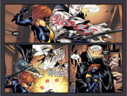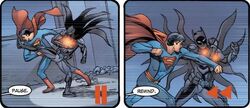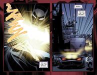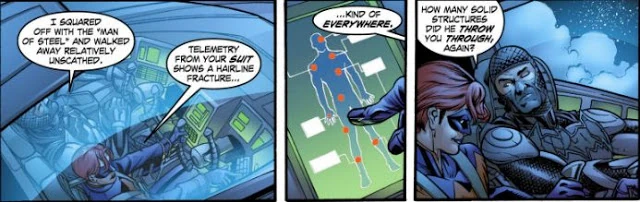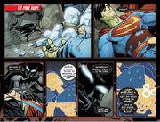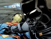 Returning to the his invisible aerial hovercraft "The Batwing", Batman and Nightwing fly off into the sky from Stryker's. Nightwing apologizes for losing Mannheim, Bruce sans cowl surprisingly gives a creepy smile which makes Barbara unease. Bruce reassures her that his smile is related to going toe-to-toe with The Man of Steel and coming out relatively unscratched. Barbara points out that the telemetry from the ships computer shows the suit received hairline fractures all over Bruce's body. She jokingly asked him how many sold structures he was thrown through by Superman. Bruce merely glances broodingly at her as he informs her he planted a tracking device on Superman during their battle. He also surmised that Superman must like him since he didn't throw him into space.