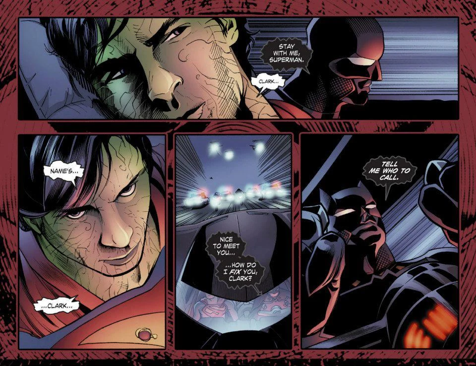 Superman super plunges Batman into the penitentiary's main cell block, Where he engages him once more and apologizes for not put him into consideration as much as he did regarding his presence or intention. Superman also express that he'd like to stop fighting Batman. Batman replies that it's not about the fight it's about misdirection. Superman is aware that Green Arrow is currently on the scene above fighting against Nightwing and assures Batman that Arrow won't harm his partner. Batman firing his bat-grappling gun upwards reveals he isn't concerned about Nightwing. Superman using his super-hearing recognized a familiar pattern to his voice speech and deduces Batman's identity as none other thanBruce Wayne.