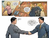 Lex graciously declines the offer insisting that he's currently think about the welfare of his employees. Since currently his company been through enough turmoil with Tess running it into the ground and then some psychopath doppelganger posing as Lionel destroyed whatever remained. Bruce reveals to Lex his relief in Lex not being involved as he only offered this partnership as a means of being polite seeing as the Wayne family and Luthor's were almost very well acquainted at one point. Unfortunately Thomas choose to stay clear from joining The Veritas society that Lionel Luthor had once offered to him. Lex sees the cults quest to find a the Traveler the very thing that lead them all to ruin and he's chosen the opposite. Bruce thinks that Lex share the same obsession like Lionel once did. Bruce and Lex's meeting is however interrupted by the presence of Superman hovering in the sky above them. Superman apologies for the interruption and Bruce uses this as his means to excuse himself as he informs them that he has another meeting to prepare for.