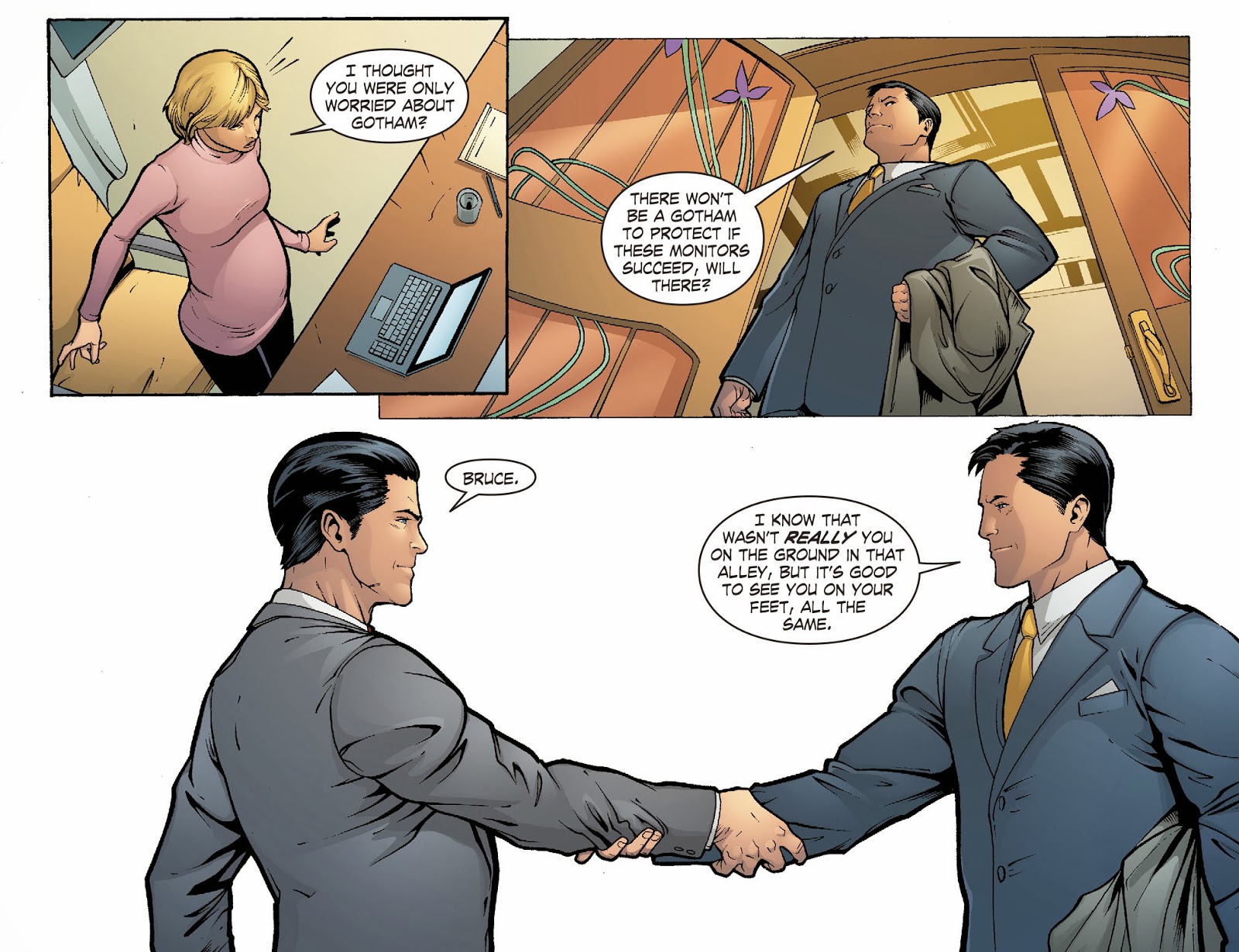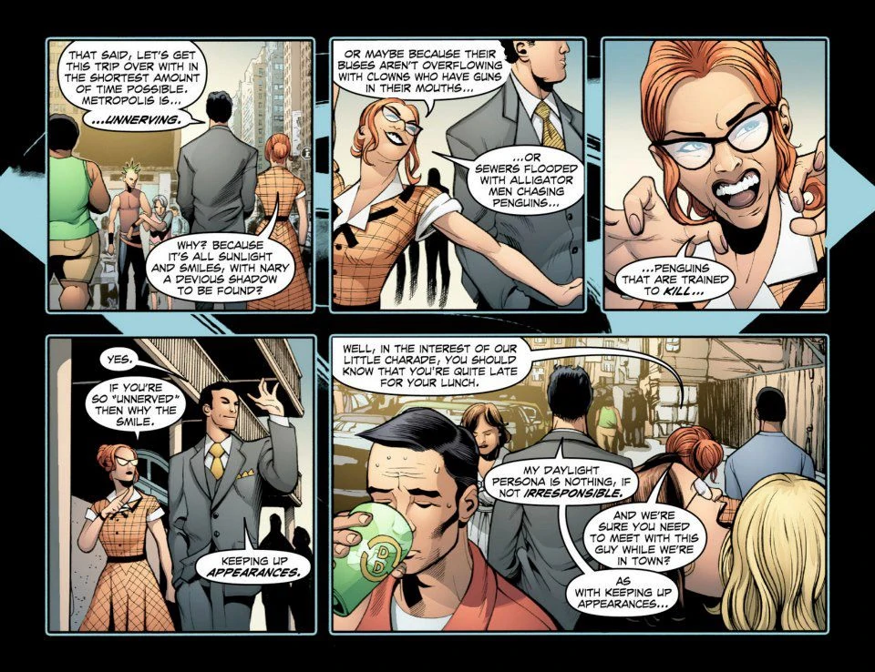 Bruce then reveals that he'd like to get through his scheduled meeting in Metropolis as quickly as possible as he finds being in Metropolis... unnerving in comparison to Gotham City. Barbara attempts to pokes fun at Bruce by referencing some of Batman's well known rogue gallery of villains (The Joker, Killer Croc, & The Penguin). Thereby addressing a lack of these type of characters found in Metropolis. Bruce sarcastically response with a Yes as he displays a smile to the viewing public around him. Barbara slightly confused asked if Bruce is so uneasy in Metropolis why show emotion of happiness in public.