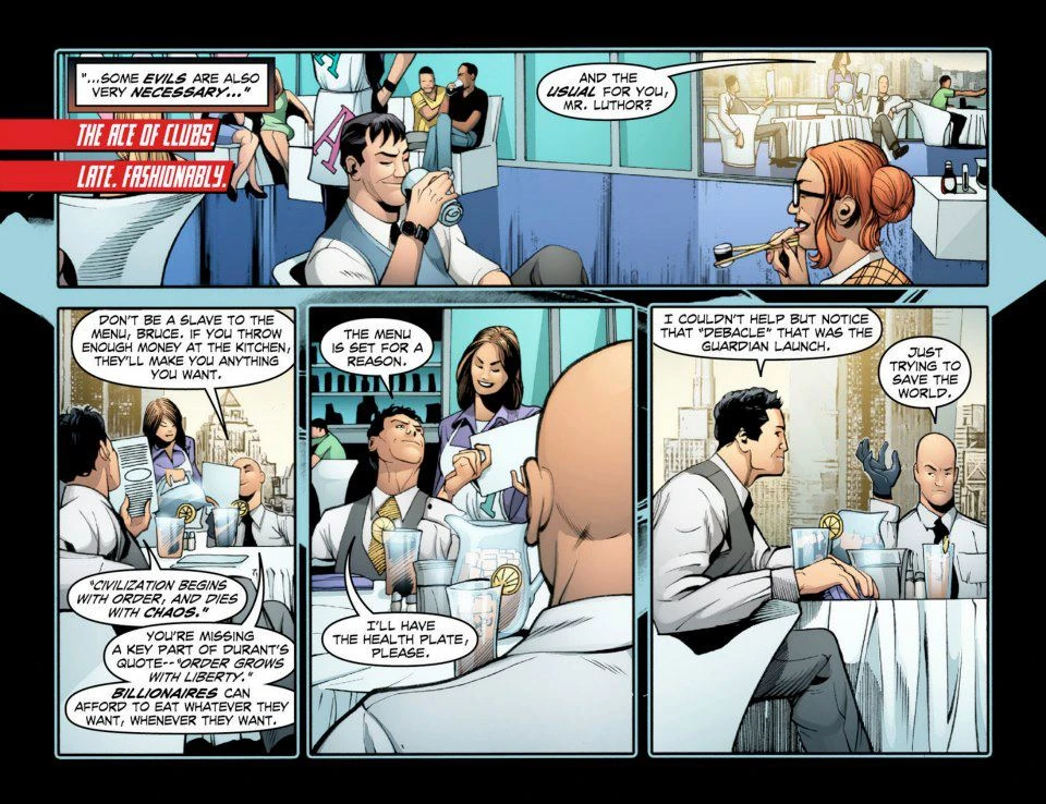 As the waitress begins to take down their food order, Lex suggests to Bruce that he shouldn't be a slave to the food menu, as he is a billionaire and is beyond restriction. Bruce however disagrees and orders the Health plate while counter acting Lex's statement by quoting Will Durant's classic quote "Civilization begins with order, and dies with chaos". Lex finishes the quote by adding "Order grows with liberty". Bruce then mentions the debacle that occurred with the Guardian space launch. Lex merely address it as his attempt to save the world. Upon further discussion Bruce asked Lex if he'd be interested in saving the world in a different way. He reveals to Lex that WayneTech has recently undergone constructing a super collider in Antarctica with a joint company venture between Michael Holt and Ted Kord committed to the project already would LexCorp be interested in joining the fight to save the world from itself.