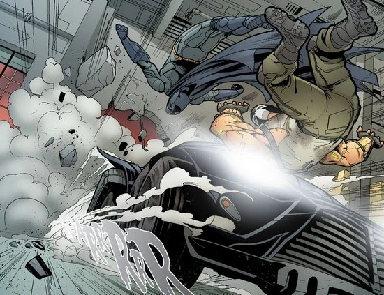 Batmobile: Batman's personal and primary vehicle means of transportation on the streets, simply called "The Car", is a heavily armored bat-stylized-tank-like automobile equipped with an extremely powerful engine. the Batmobile has no problem breaking through a police barricade or the side of a building to securing Batman and the injured Superman (Detective). Its equipment include: short-wave police radio with microphone, losed circuit television, morph changing device, missiles and voice-command recognition. Also, the Batmobile is accessible to be driven remotely from the cave or The Leviathan ship control computer by Nightwing. The Batmobile also contains shields which are made of ceramic fractal armor panels, simiar to the shields of the Batmobile from the Tim Burton Batman movies. They explode outward when struck by projectiles, deflecting injurious force away from the car and its occupants. If Batman must leave the Batmobile for an extended period of time, he can activate the Batmobile's shielding system. This prevents anyone from tampering with the vehicle while it is left unattended. Bulletproof and fireproof steel armor plates envelop the body and cockpit entirely. While this armor is in place, the vehicle cannot be driven. (Effigy).