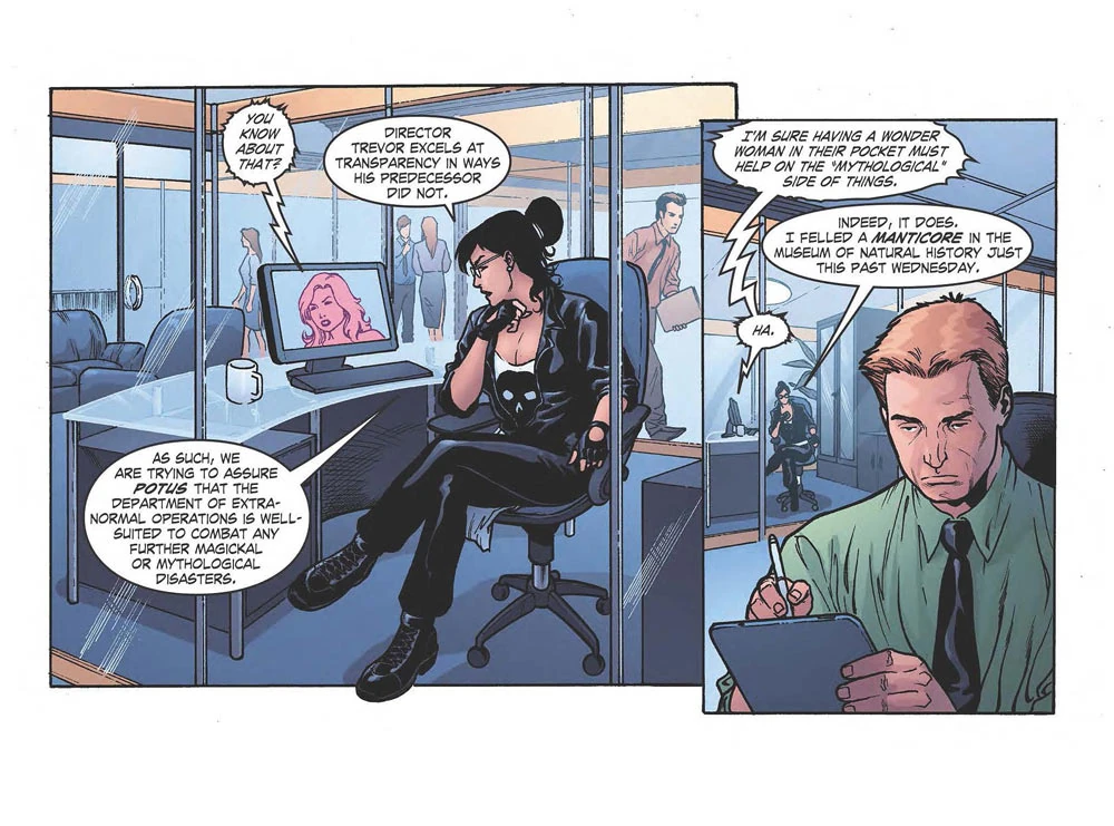 In an underwater facility of the D.E.O., Director Trevor confirms to Watchtower that there have been incidents related to the yellow rings in Washington, D.C. as well. According to Trevor, the rings focused on the U.S. Congress, with half the Senate and half the White House becoming the new carriers and starting attacking each other. Wonder Woman is already there, trying to control the situation but according to Trevor she will need all the help she can get.