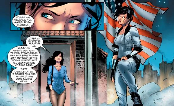 On the roof of a building in Washington, Lois Lane has tracked down the vigilante dressed in white and has an encounter with her. Both women talk about the new vigilante's purpose in Washington. Lois mentions that the U.S. is a very proud nation and the vigilante says she comes from a very proud nation too. It seems that both women are starting to get along well, when they are suddenly interrupted by the appearance of some dreadful-looking winged creatures, which, as the vigilante says, come from a place of legend and magic.