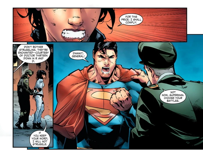 Bones then says to Diana that he can take her to her mother. Diana accepts the offer and to even being handcuffed with magical shackles, saying that if they keep their word she will not struggle. D.E.O. then takes Diana into their custody and moves her from the scene.
