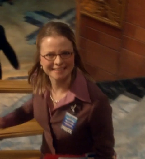 She was heading up the stairs from the Daily Planet bullpen, when she walked past Chloe Sullivan (then looking like Lois Lane), and mistook her for Lois. She complimented "Lois" for the work on a city hall piece that the real Lois Lane had written.