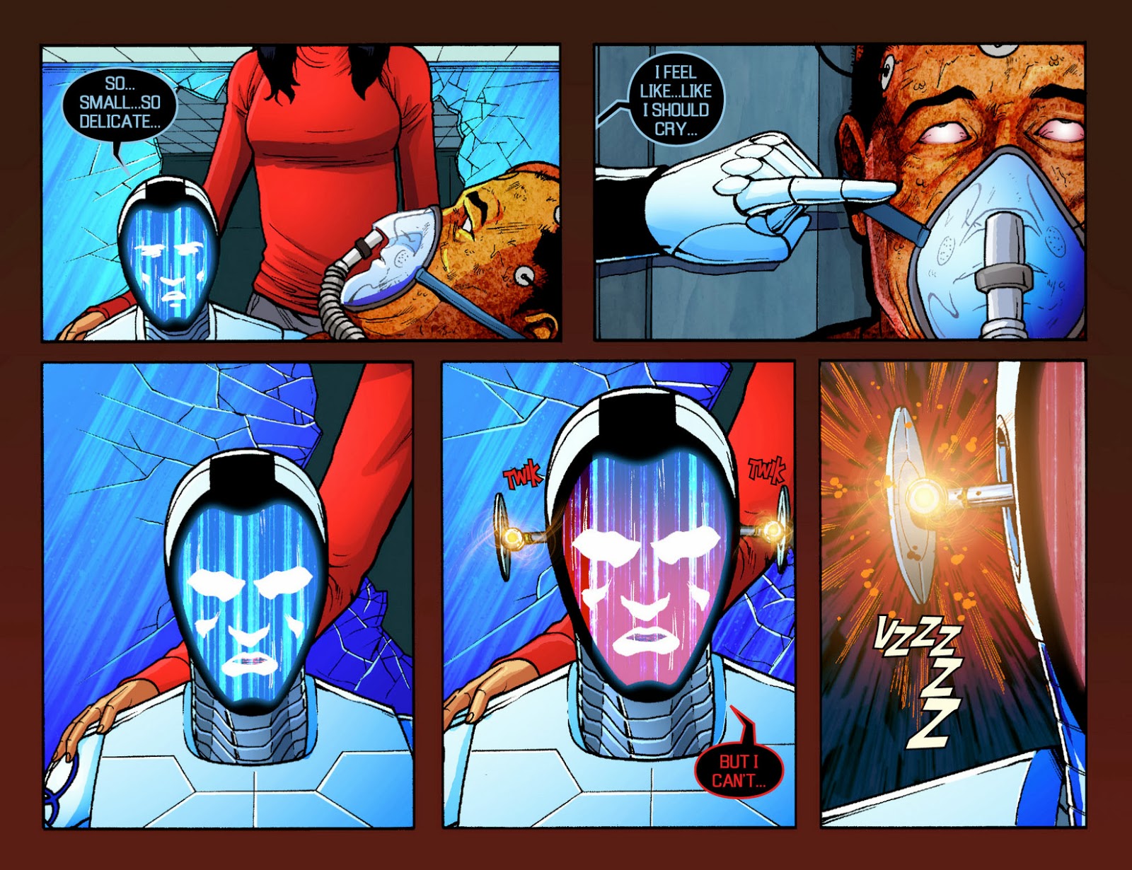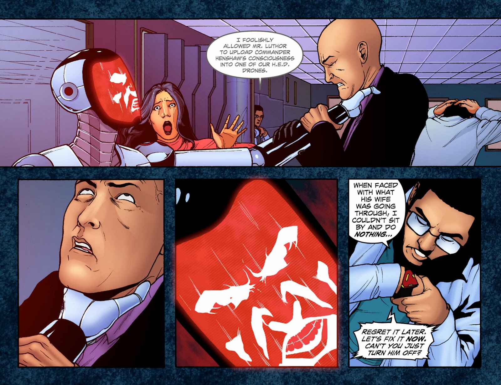 In the solitary stasis, Henshaw determines he has to do something to help with the situation as it is his chance to redeem himself and his wife along with the rest of Metropolis need him. He manages to sneak past the possessed civilians into a storage room filled with drones and then he takes control of one of them with a huge body armor. Inside the room the scientists have confined themselves, Emil is ready to defend himself so when the door opens he gets out holding a piece of metal. Hank, who is in his new body and has the "S" symbol on his chest, calms Emil down and asks him if he was expecting Superman instead.