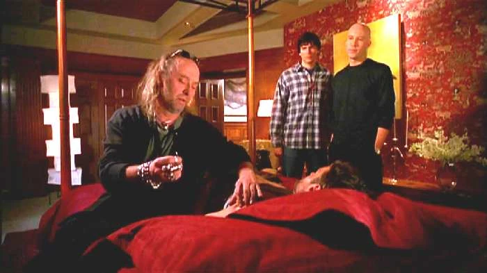 Bob approaches Lex at the Beanery, but Lex won't shake his hand. Clark comes in and asks Bob how he got his dad to sign that contract. When he shakes Bob's hand, he shows uncanny resistance to the handshake and nearly crushes Bob's hand. Chloe reveals that Rickman and Tippet were trapped in their car during the meteor shower, then afterward were the salesmen of the year for three straight years. They return to the Luthor Mansion to talk with Kyle. He is missing, and it seems that he has persuaded the staff to forget all about him. Clark guesses that he has gone back to his trailer in the woods.