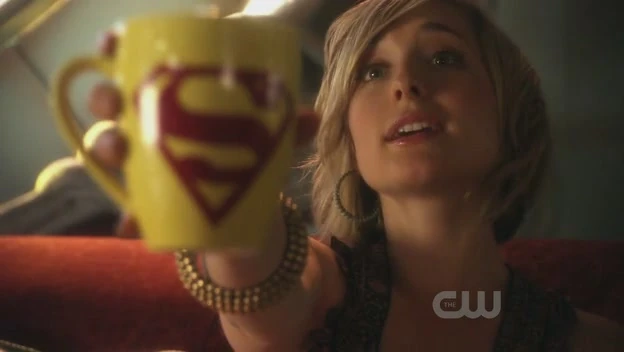- The S symbol on Chloe's coffee mug is red and yellow, classic Superman colors. The symbol itself is the classic Superman symbol from the comics, instead of the Superman Returns style shield.