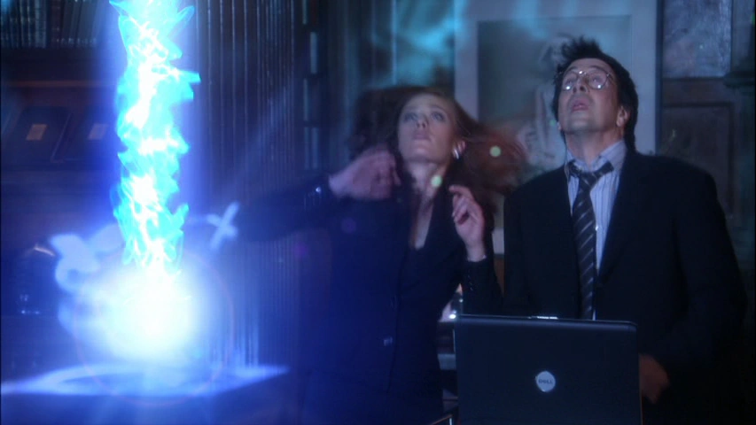 Dr. Groll believes that perhaps the answers Tess is seeking can be found within the crystal computer hard drive using a high frequency generator device. Activating the device the crystal emits a blue high energy pulse beam into outer space almost like a beacon, startling both Dr. Groll and Tess in the process. Tess asks "What just happened?".