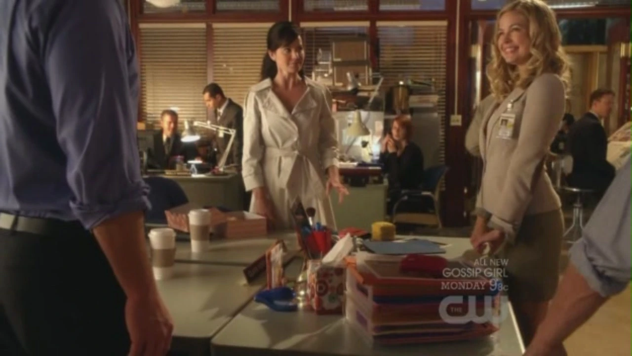 Back at the Daily Planet, Lois is rearranging her and Clark's desks and placing things in order as she prepares to tell him she knows. Clark walks in nervously and they both begin to tell each other about their respective secrets when they are interrupted by a desk being slammed into theirs. Cat Grant then appears and begins to undermine Lois by trying to get Clark to work on a story with her about the missing amulet of Isis. Clark defends Lois, with both of them being annoyed at Cat's entrance. Lois reveals that she is covering the Gala for Oliver and turns Cat down on working together on a prospective story. Clark leaves and subtly tells Lois to meet him on the roof in five minutes. Lois is ecstatic at Clark's message and heads to the roof.