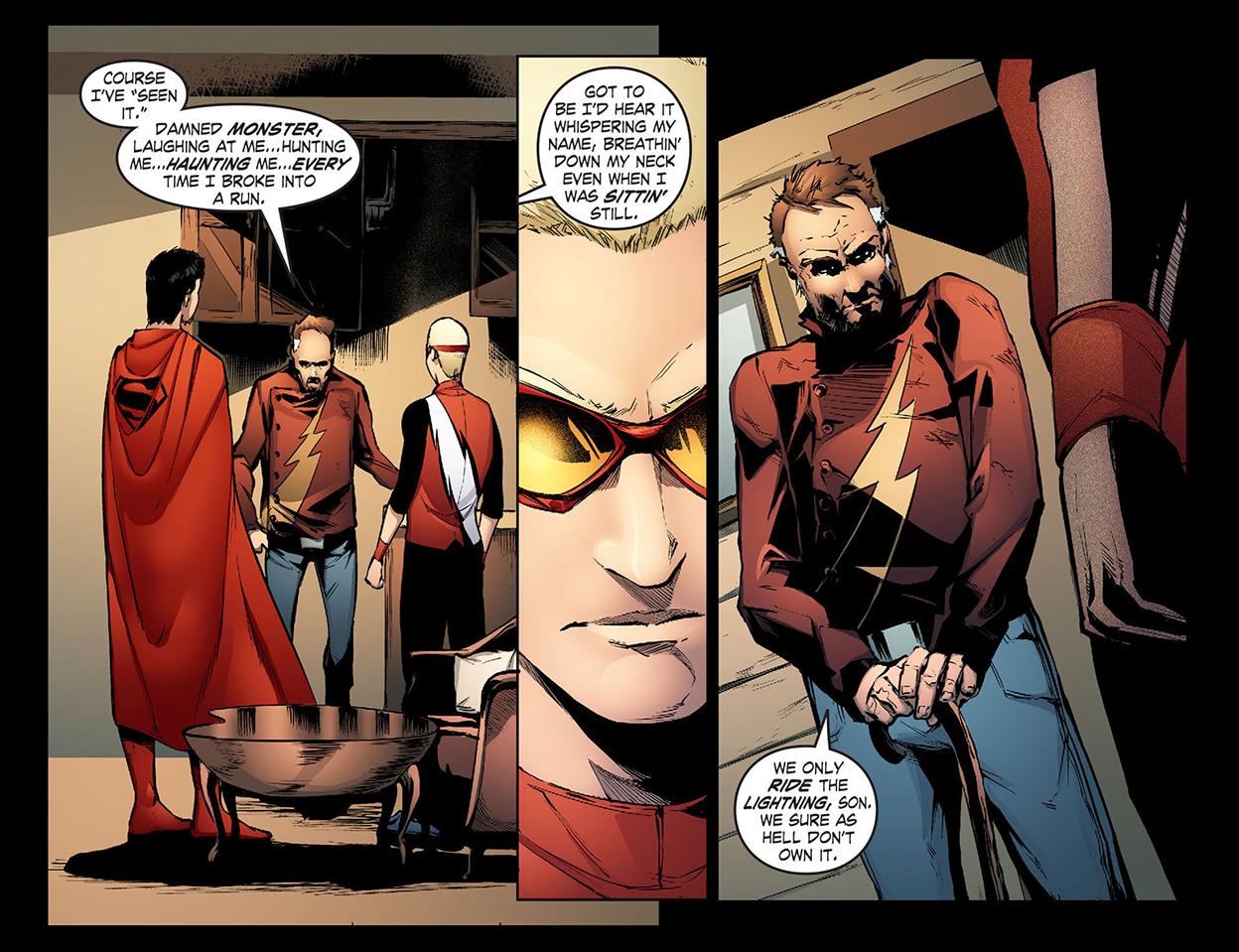 Bart asks Garrick how many speedsters there are. The old man gives a mealy answer about not being the first and Bart not being the last. Bart confronts him about not having raced the demon himself to stop to have possibly stopped it, and Garrick denounces their abilities as a curse. Clark offers that curses can be blessings if they don't let their powers control their lives. Garrick likens Clark to Carter Hall and Bart jumps on the moment to call him out for not having stayed in touch with his team, mentioning that even though he didn't know Carter he still attended his funeral. The old man owns up to not being proud of how he acted, but it's not good enough for Bart. Riled up, he starts tapping into the Speed Force before Clark manages to stop him.