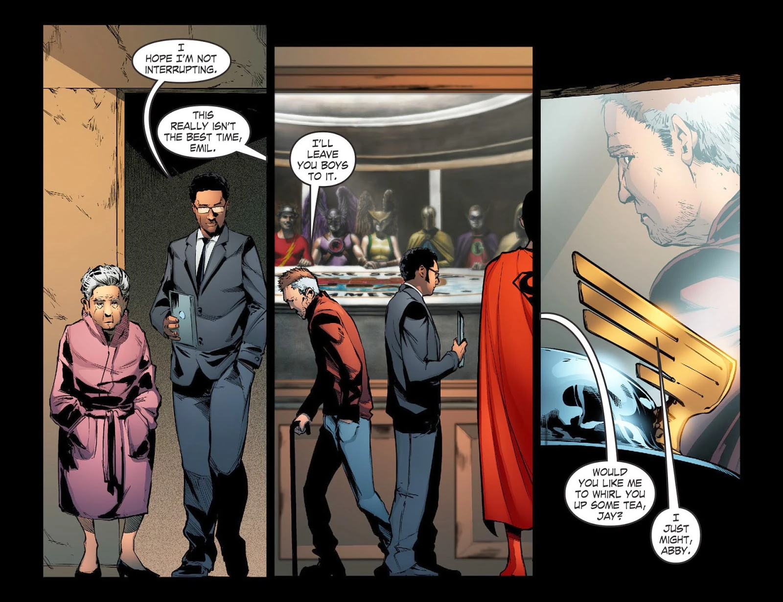 Later Jay and Clark meet at the JSA brownstone and talk about Bart and Carter. Clark tells him not to blame himself but Jay feels like he should have done something about it years ago. Jay leaves with Abigail when Emil shows up, but not before looking at his old tin hat.