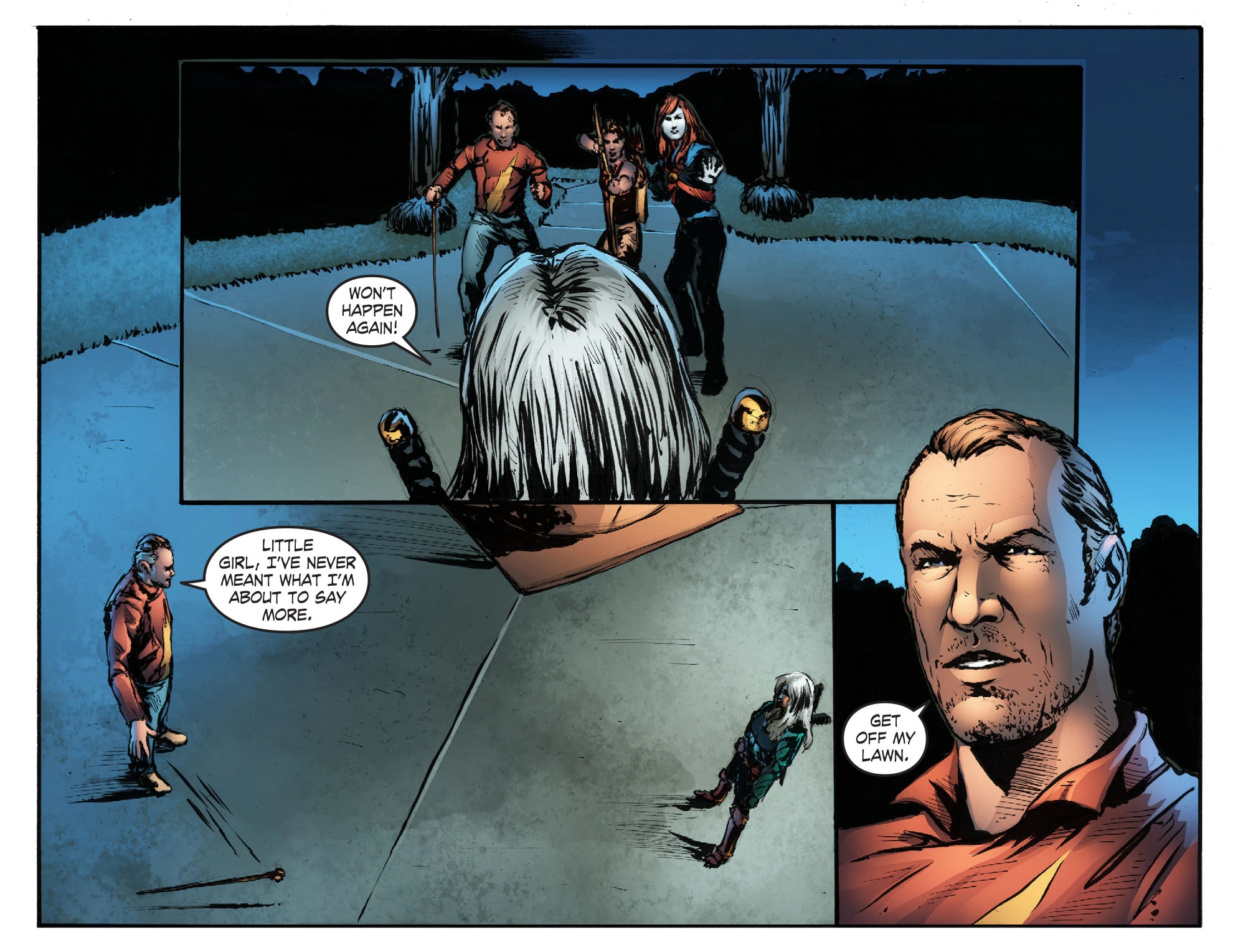 While Mia Dearden and Jayna are talking, and Mia asks Jayna why she and Zan joined Garrick's team Jayna responds that they felt lost and they needed some guidance and gear. Garrick then suddenly appears and says that they don't always need gadgets and gear and that Bart Allen outran his past so they can do the same. He then says to himself that he won't let Bart down by giving up on his students no matter how often he feels they want him to do so.