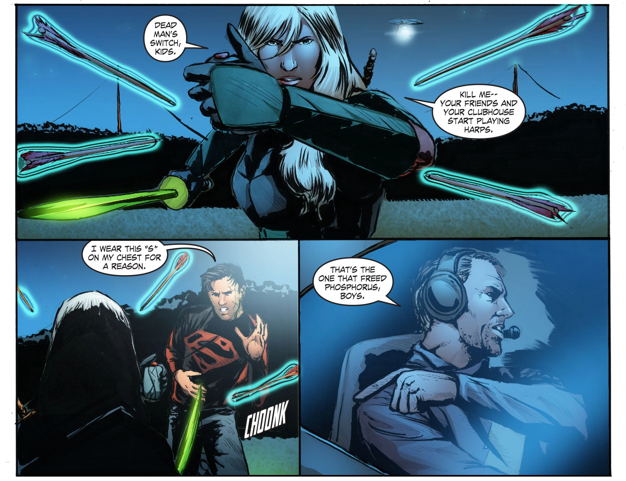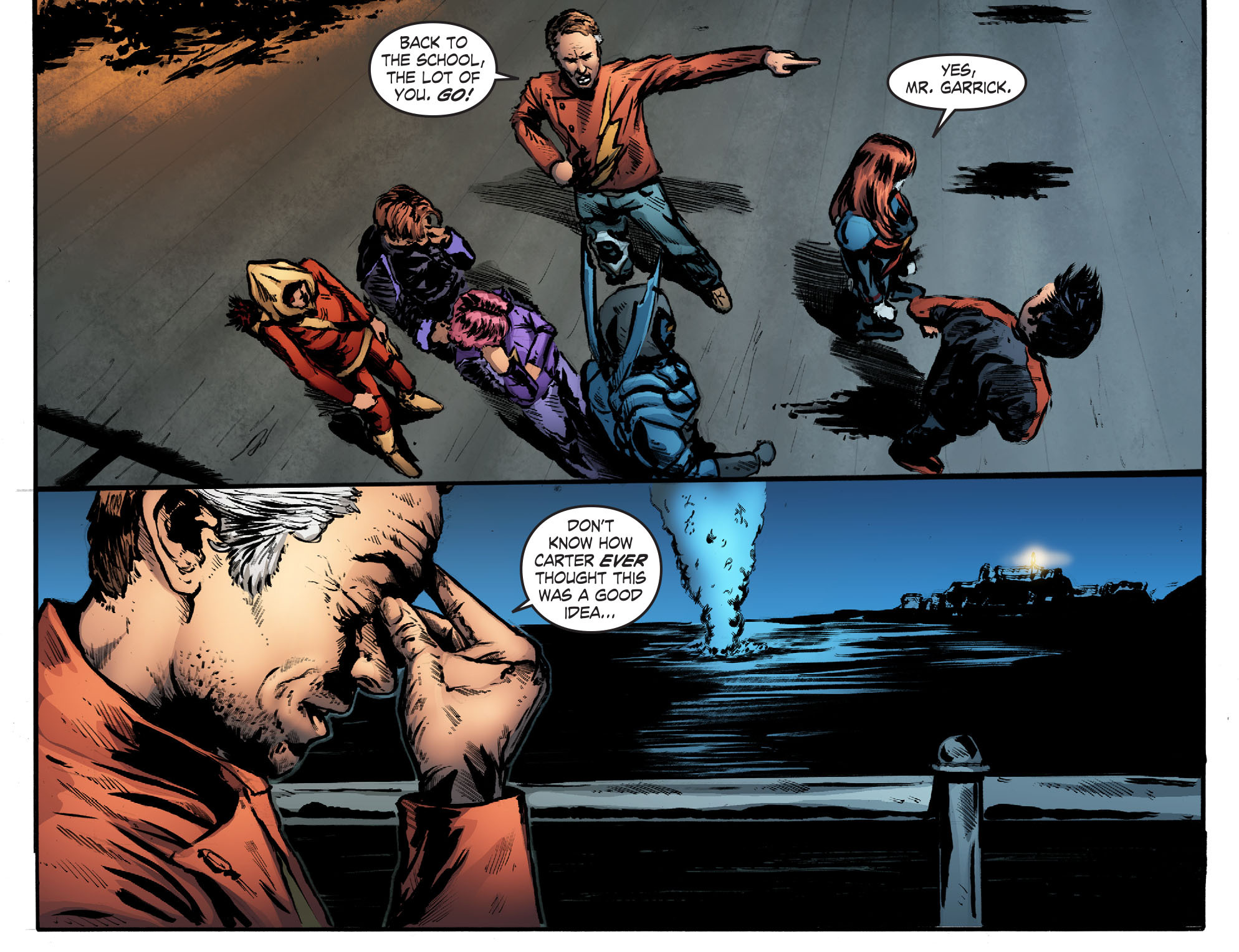 At the team's headquarters Garrick talks to his students a little bit about Bart Allen's life, how Bart was the inspiration for the creation of the team and the Titan Corporation, which funded the school. He tells them he is very disappointed about their first mission and he is not sure if they ever will be ready for field work. Mia says that they couldn't just sit there and do nothing while Phosphorus was causing havoc and Conner says that Garrick is not fair with them. Jayna and Zan also say that they had to stop him but Jaime says that Garrick has got a point. Megan says that the discord is clouding her mind but Garrick tells her to toughen up. Garrick then informs them that the D.E.O. wrangled Phosphorus back to prison and that they would probably succeed stopping him themselves, without the team's interference. Conner asks if he knows how Phosphorus escaped in the first place but Garrick says it's not their problem and if they make some more mistakes like this one it won't be even possible for Superman to convince the public that this team should not be locked away, too. Conner then angrily asks Garrick if the reason he treats them like this is because he is jealous they are younger and faster than him. Jay suddenly speeds towards Conner pushing him to a wall and says to him that the "S" on his chest means his teammates look to him for leadership and none of them actually know that he is a clone of both Clark Kent and Lex Luthor, so he must choose which of his sides of his DNA will win out.