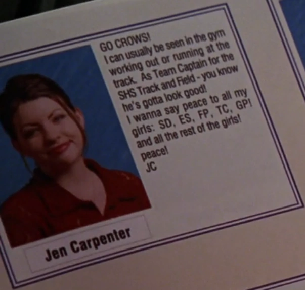 Jen Carpenter was a student at Smallville High School in 2005, and classmate to Clark Kent. Jen was the Captain for the Smallville High School Track and Field team.