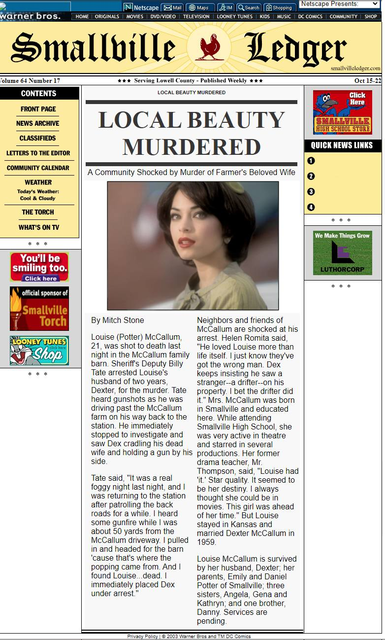 - ↑ 1.0 1.1 1.2 1.3 1.4 1.5 https://smallville.fandom.com/wiki/File:SmallvilleLedgerLocalBeautyMurdered.png