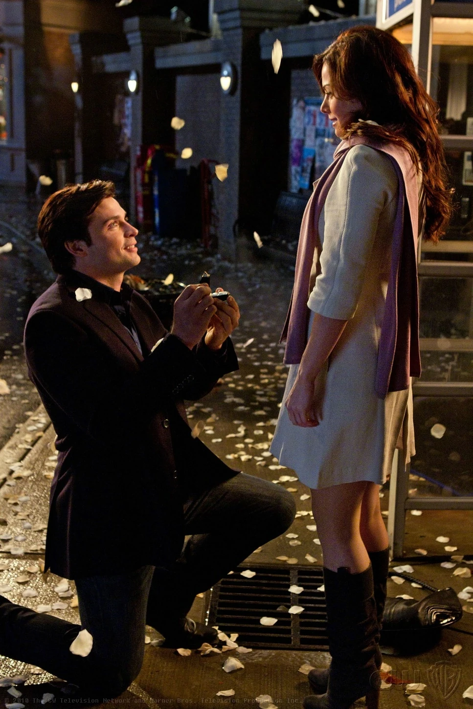 A week later, Lois is scheduled to meet Clark for an 8:00 dinner date but is unfortunately held up at work and arrives late. Yet despite her tardiness, Clark is very delighted to see her and prepares to proceed on forward with his arranged mapped out Marriage proposal planed evening at the newly opened restaurant he'd reserved registration for them to attend. However Clark's plans are derailed by the newly issued curfew by VRA and Lois wanting to protect him from the patrol unit. Clark not wanting to delay proposing any longer decides to improvise on the spot. By pretending to responding to a situation that requires his full attention, He then calls Lois from their special phone booth nearby. Upon answering the phone, Lois asks him if he was able to save the day and he tells he doesn't know yet but she should look up into the sky. The entire street begins raining white rose petals. She turns to see Clark walking toward her and he tells her that she doesn't make it easy to ask a simple question but that's what he loves so much about her. Clark tells her she is the woman he truly loves and wants to spend the rest of his life with and upon bending to one knee he pulls out a ring, asking Lois to marry him. She happily says yes without hesitation and they share a passionate kiss. The next day at the Daily Planet, Lois received a letter attached with a special necklace from Chloe congratulating Lois on her engagement to Clark. Then later that very evening, Lois and Clark were treated to a surprise engagement party that Tess hosted at Watchtower with the other League members.