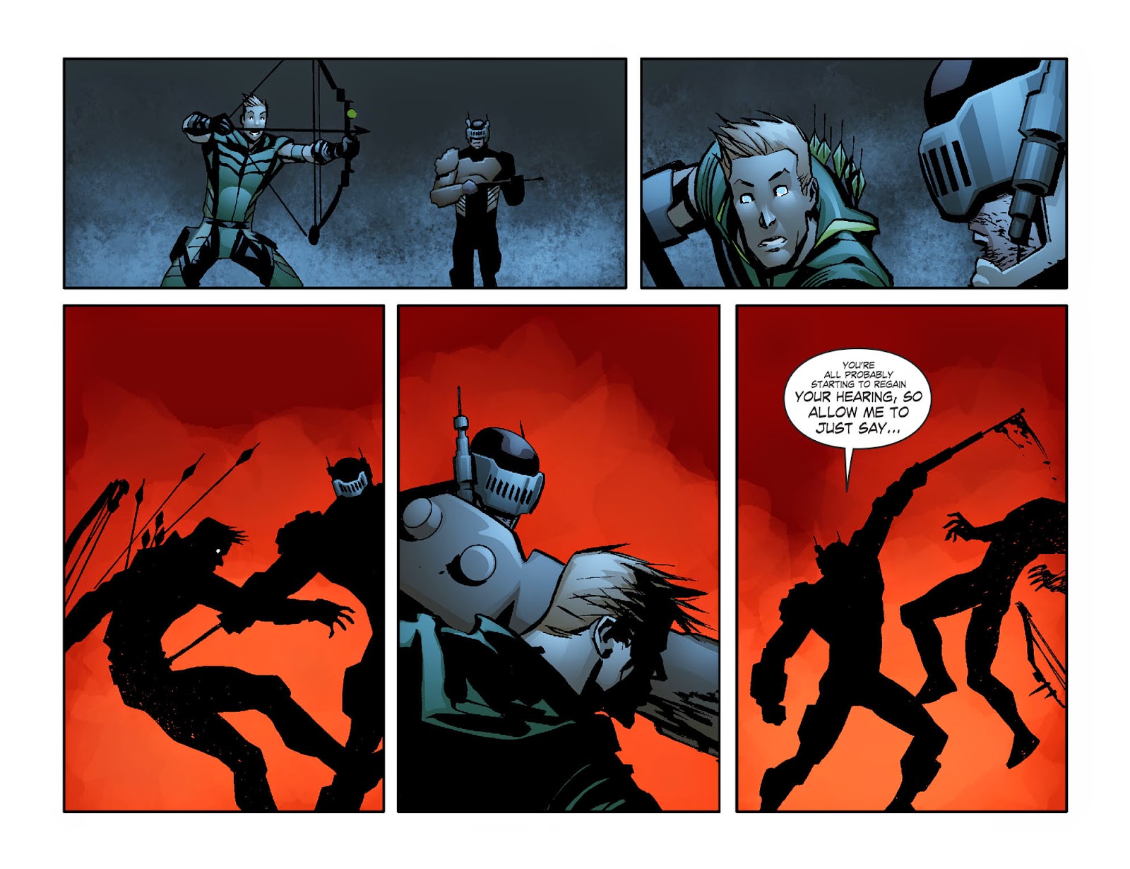 ↑In the Oliver Queen Chronicles, he shoots a purse-snatcher in the leg while perched on a remote rooftop.