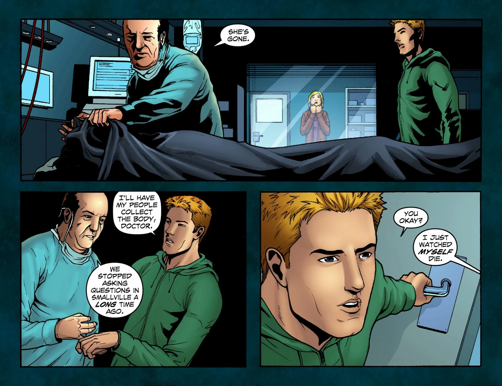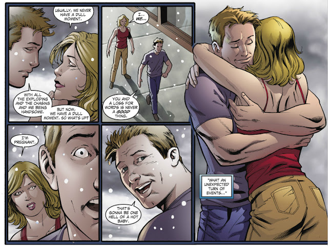 Superman knocks the crew out and ties the bunch together around a pole. A short time after, Ollie and Clark, now in street clothes, watch as Metropolis PD comes by to apprehend the thieves. Ollie's a bit surprised Clark didn't stay in costume to greet the police, joking that Superman is "all about standing around, shaking hands, kissing babies..." As they walk off, Clark retorts that Superman has never kissed a baby. When Ollie asks if Clark Kent has, Clark mentions an exploding baby from his past. When Ollie exults about not having to experience such things when the Queens move to Star City, Clark expresses surprise that they haven't left yet. They were supposed to have left but the hold-up is on his wife, Ollie says. Chloe confides in Lois that Oliver is currently rebuilding Queen Industries while going out and being a hero, as she's busy taking care of Watchtower and setting up similar Watchtower hubs in each of the Justice League member's home cities while working her day job as a reporter for the Star City Gazette.