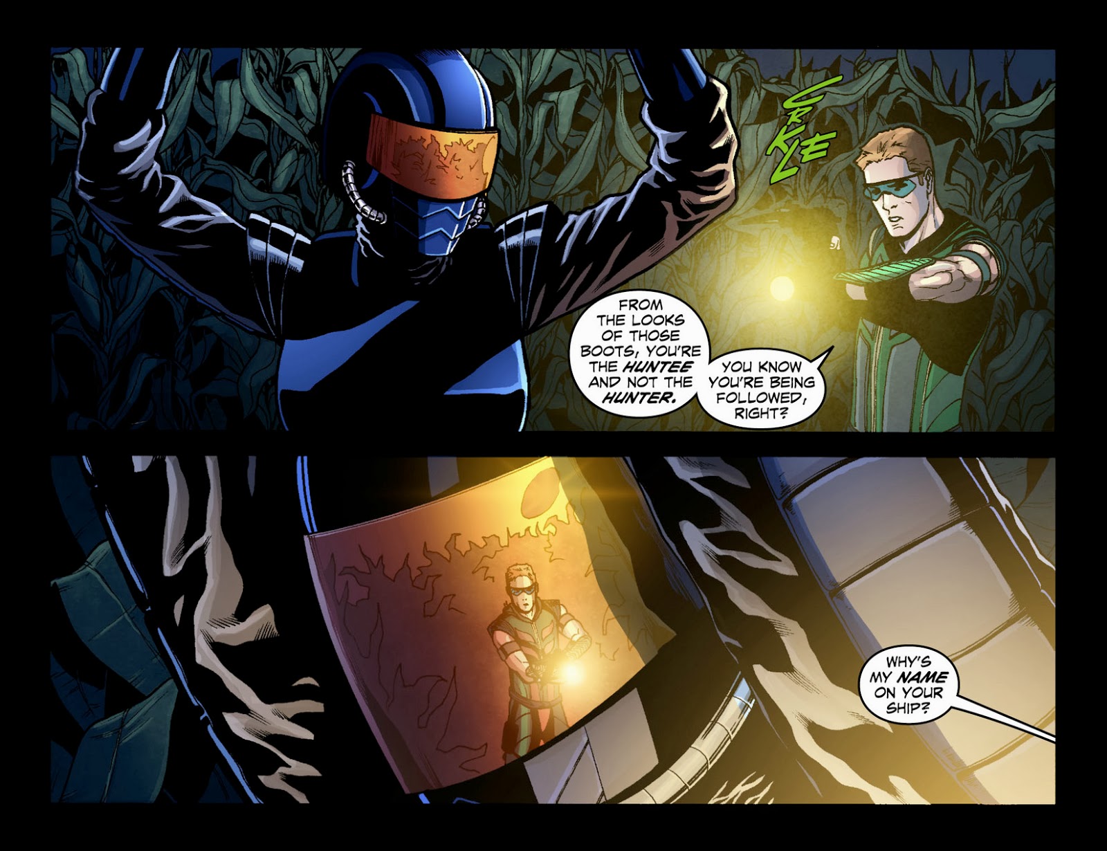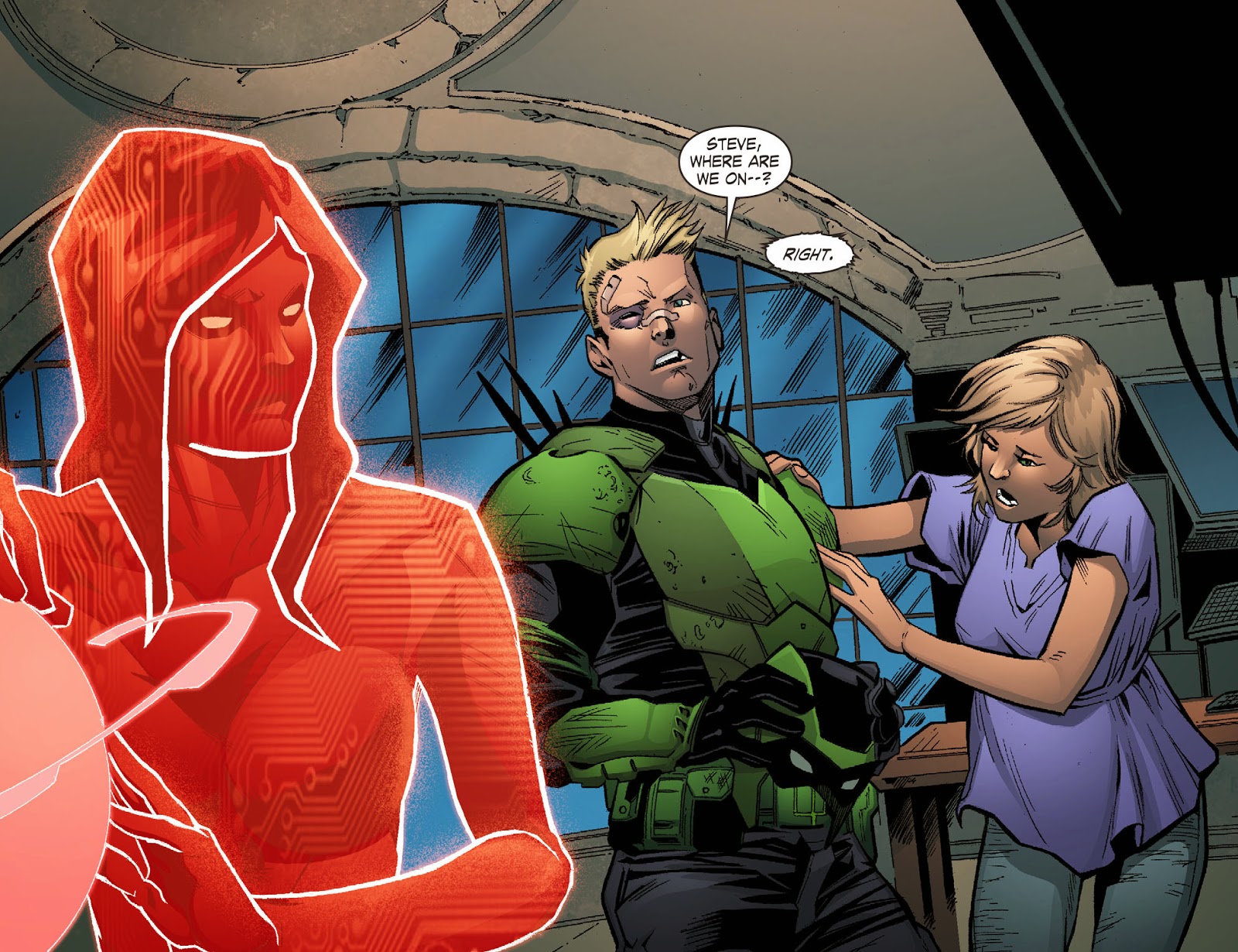 Green Arrow can be seen on security camera footage that Lex views in Combat.