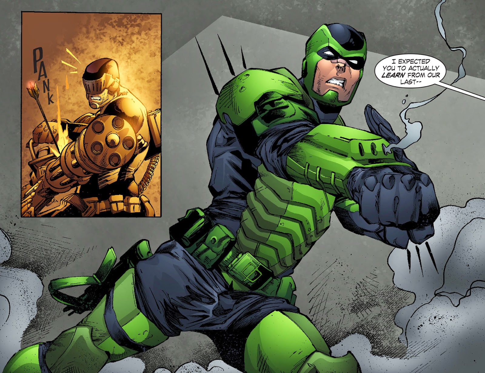 Green Arrow later patrols the city and arrives to the Port of Metropolis, in order to apprehend a crew of thieves who attempts to raid a shipping container.He's surprised by one of the goons who has climbed on top of a stack of containers and trains an RPG launcher on the Emerald Archer. Before Ollie can react, the goon fires. Just before the RPG strikes him, Superman zips into the area and stands in front of it, shielding Ollie from the hit and the explosion.