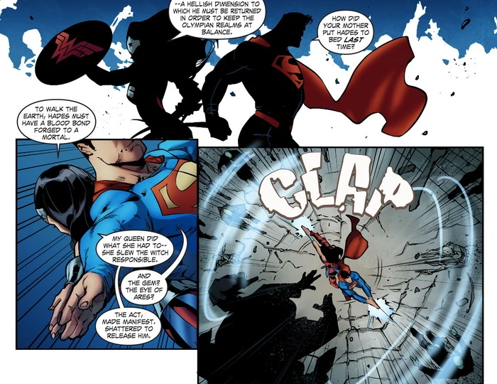 Superman and Wonder Woman begin to fight against Hades' harpies, and during the fight, Diana explains to Clark that the only way to defeat Hades is to send him back to Tartarus, a hellish dimension where he was imprisoned by Hippolyta years ago, in order to keep the Olympian realms in balance. She also says that her mother in order to imprison Hades in the first place she had to kill the witch who served him, meaning that now they have to kill Faust. Superman says that is not going to happen and there is always another way, taking Hades and flying him into outer space.