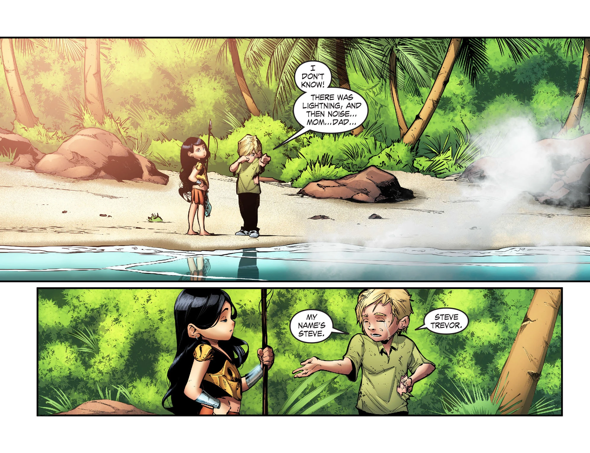 Fifteen years ago at Themyscira, young Steve Trevor still lives on the island and has also buried his parents, who died on the accident, there. Diana takes care of him, and the two seem to be very close. While playing football, with a ball that Diana has made from a pig's skin, they end up falling into a lake and suddenly Hippolyta, Diana's mother, appears followed by a group of her Amazons. The presence of men is not permitted on the island, as a young Amazon says, and she states that they have to kill Steve. Diana starts a fight with the young Amazon defending her friend. Then the Queen, after commanding her fellow Amazons to take the boy, cuts the discussion saying she knows what to do.