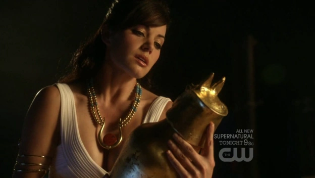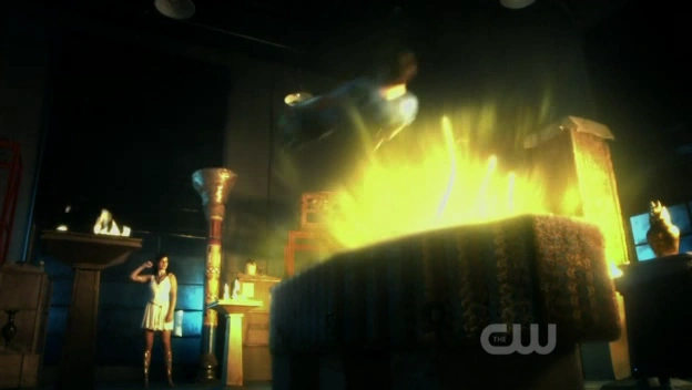 Isis declares that it cannot be over because their love is eternal and that Clark knows nothing about love. She then proceeds to push him onto the sarcophagus and binds him down, getting ready to sacrifice him to Osiris. Cat Grant who watch her from distance is shocked and she accidentally knocks a statue over and breaks it. Isis turns and Cat runs away when she bumps into Green Arrow. She senses Oliver behind her and notes that he doesn’t want to hurt Lois' body and then throws an energy ball at him, which he dodges. Oliver reveals to Clark that the only way to trap Isis is for the sun to hit the amulet again, thus trapping her spirit. Isis again throws an energy ball at Oliver long enough for Clark to break free of his restraints and grab Osiris' heart. Clark threatens to destroy the heart unless Isis releases Lois. Isis, seeing no hope, attempts to stab herself. Oliver fires an arrow at the amulet, sending it towards Clark, who uses his heat vision on the amulet, retrapping Isis in the amulet and freeing Lois.