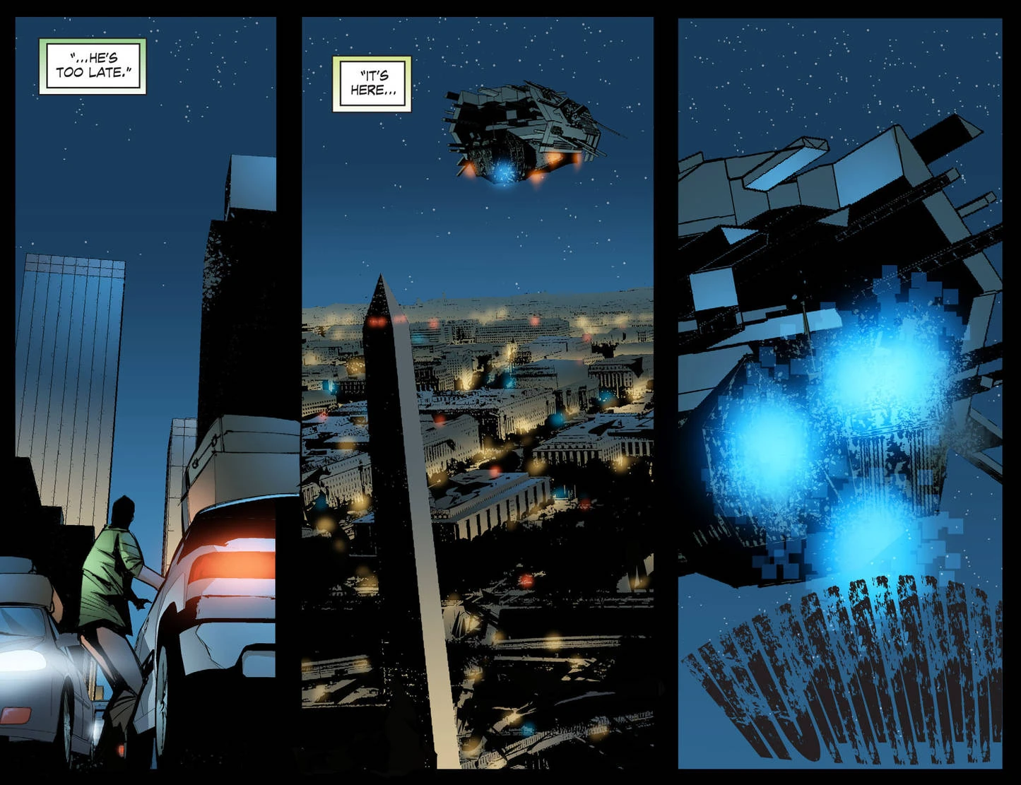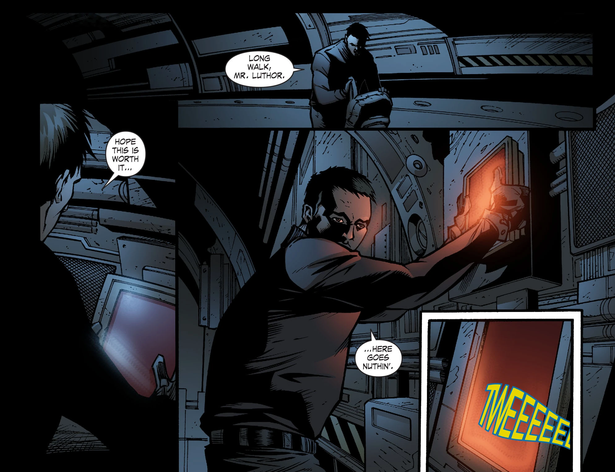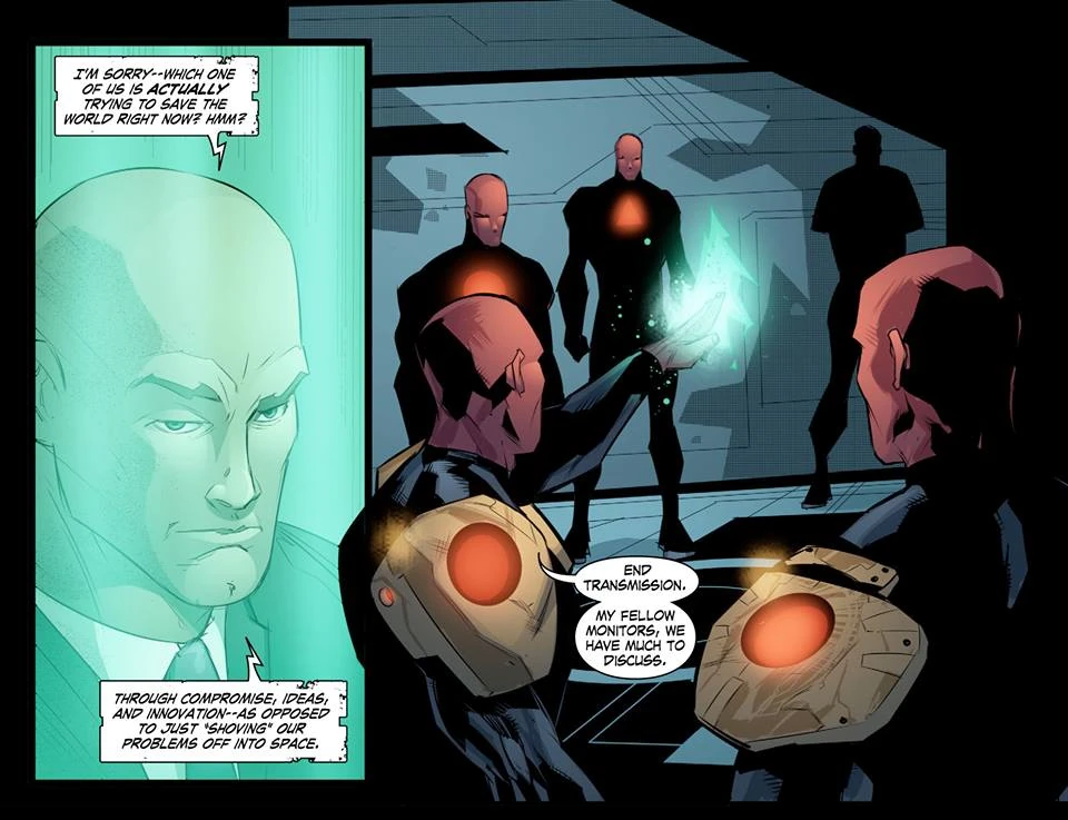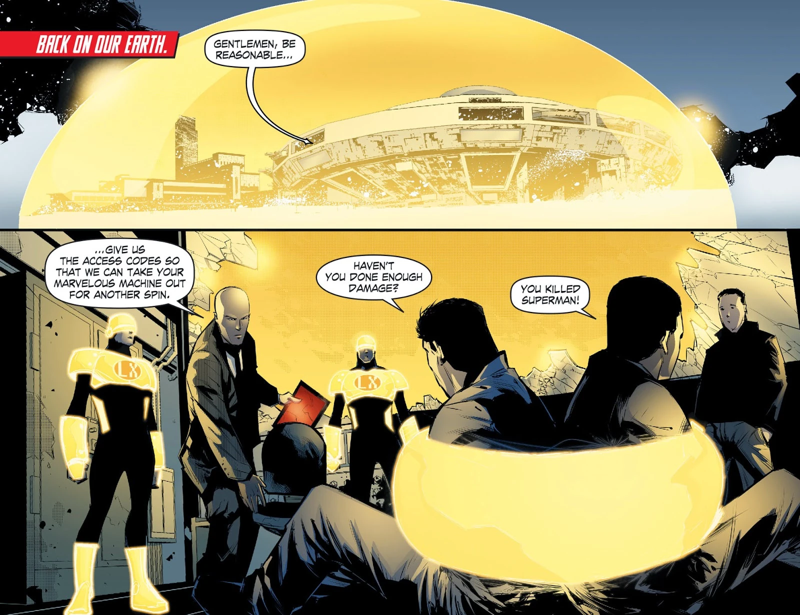 In Antarctica, Lex is ready to leave, saying to Kord and Holt that "he's out" as the facility is unstable, given the fact that Superman and Lois Lane disappeared. Otis informs him that the Monitor's device has already started to lose charge and Lex says that he was hoping not to reveal his new security force so early but now he doesn't have a choice. Holt says that he doesn't need any security force as their own private security, Booster Gold, can escort his plane back to domestic airspace but Lex reveals that he lied to them and that he intends to buy Holt and Kord out. Kord says they are not selling but suddenly Lex's private security, which is revealed to be powered by rings of the Yellow Lanterns, fires at them and Lex then says they should consider it more of a hostile takeover.