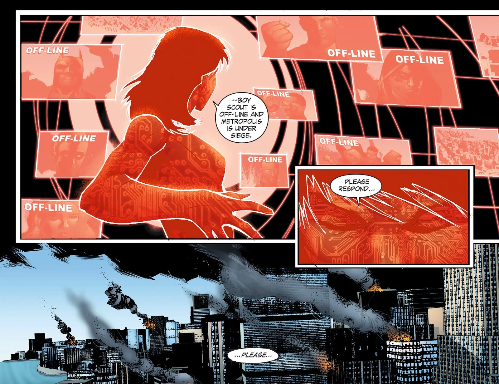 In Metropolis at Watchtower, Tess contacts Emil to inform him about the effect of Eclipso that is spreading all over the city. Emil tells her that he is already aware of the situation as possessed citizens are attacking S.T.A.R. Labs, at the same time. Suddenly their link is terminated and Tess loses contact with Emil. An overwhelmed Tess is trying to contain the mess, launching an SOS signal to all the heroes who are available, even though all of them seem to be off-line, as havoc breaks loose in Metropolis thanks to the ever-growing army of Eclipso.