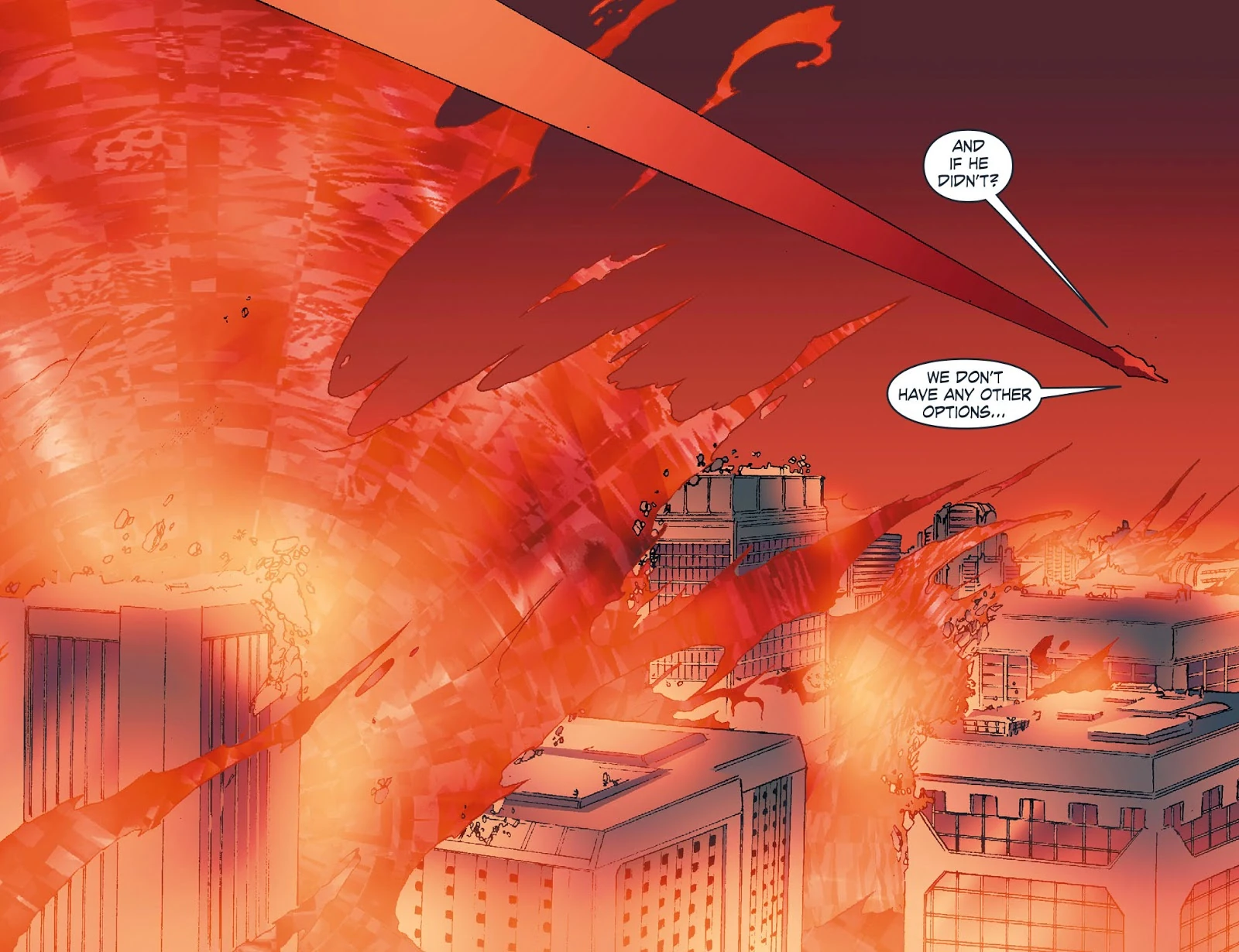 On Earth-Majestic, while Superman is imprisoned inside the golden crystal, the huge wave of Bleed approaches the Fortress, devouring everything in its path. After arguing with him, Lois manages to convince Jor-El to release Superman and help them travel to another parallel world. Jor-El tells to Lois everything he knows about the multiverse but he says he can not guarantee them they are going to end up back at their Earth and also asks her if she can take him with them as well. Lois says that they will take their chances in order to survive and then agrees to take Jor-El with them. Jor-El then downloads his consciousness in a crystal and teleports everyone somewhere else, moments before this Earth gets devoured by the Bleed.