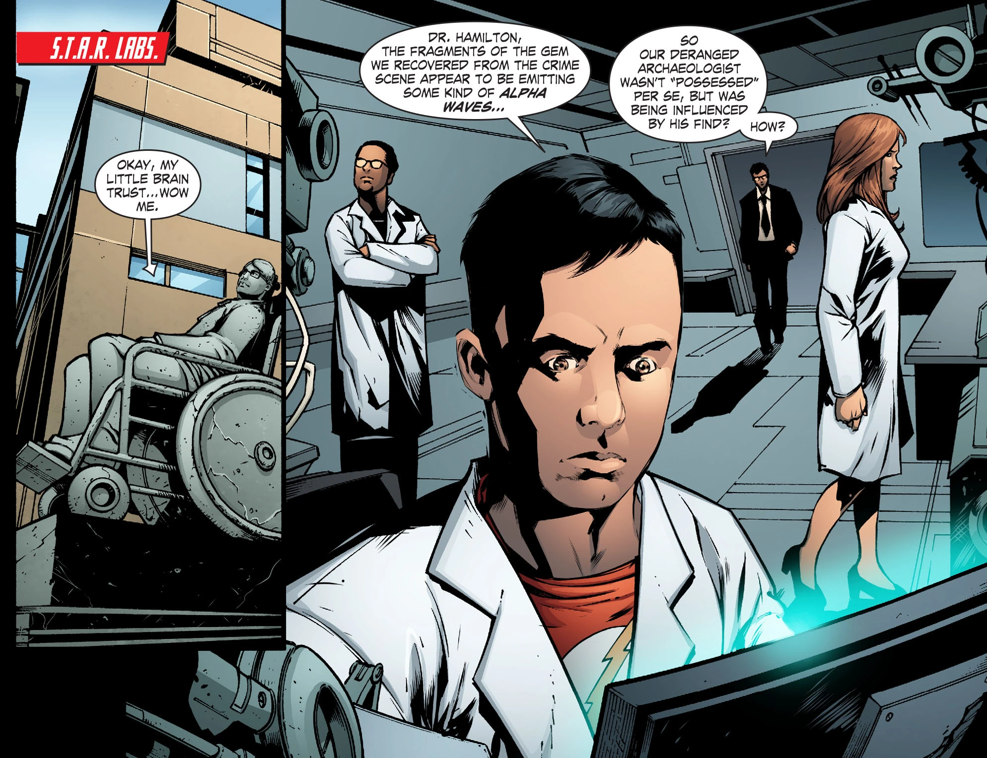 At S.T.A.R. Labs, Emil Hamilton's team have completed their analysis of the shattered black diamond. It seems the gem gives off a unique pattern of Alpha brainwaves that influence the mind of the one in contact with the gem. Moreover, every shard of the gem is emitting its own series of signals, which are talking to each other. Disturbingly, not every shard of the diamond is accounted for. Emil then tells them to call the C.D.C. and scramble a team back to the crime scene so they can prevent anyone else from getting infected.