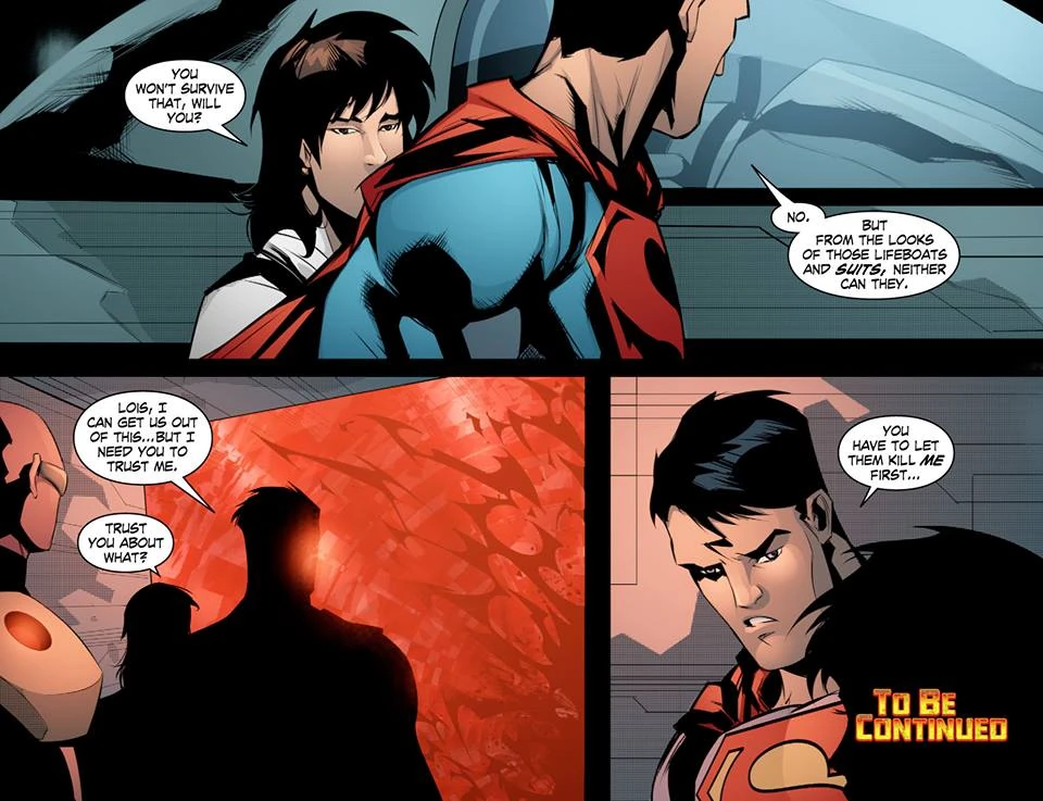 Inside the Monitors' ship, they listen to Lex's proposal to reboot the universe. Superman interrupts his proposal, saying that what he is proposing is madness. Lex is surprised to see that Superman and Lois are still alive, as he was wondering where have they ended up. Lois calls him a monster but Lex insists he's the only one actually trying to save the world by reasoning with the Monitors. The Monitors end the transmission, saying they have much to discuss. Lois is shocked when she learns that the Monitors are actually going to consider Lex's offer. The Monitors then recognize Superman as the person who killed Ray-Lan, so they decide to sentence both of them to death so they won't be able to interfere again in their plans. They intend to kill Superman and Lois by jettisoning them into the Bleed, as no one can survive it, not even the Monitors. Superman says he can get them out of this situation, but Lois will have to trust him and let the Monitors kill him first.