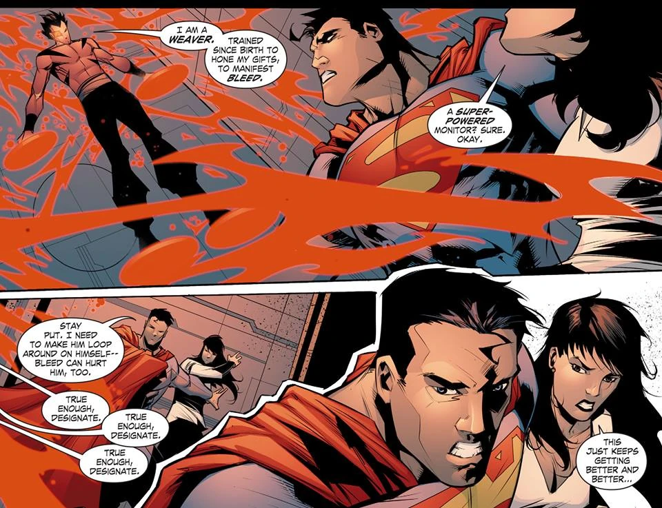 In Bleed Space, Superman allows himself to be put into a chamber, which the Monitors flood with Bleed. A tearful Lois watches him being expelled from the Monitors' vessel. However, despite the rigors of Bleed Space, Superman manages to return to the ship and force his way back in. He reenters just as Lois is about to be expelled from the ship as well. Just as a Monitor is ready to expel Lois, an alarm starts ringing. The Monitors leave to deal with the Bleed overload in the ship and Lois finds the chance to race to the lifeboats, but unfortunately she meets a group of Monitors on the way. Upon seeing her, the Monitors comment, they have underestimated their prisoners and Lois, raising her fists, responds, "You bet our ass you did."