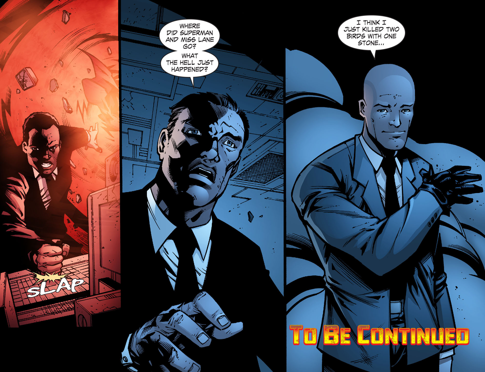 Back in Metropolis, Superman decides to end the fight by smashing the black diamond, shattering it to pieces. After that, the Professor gets back to normal but suddenly Superman hears Lois call for help and flies to Antarctica at super speed. He arrives in time to catch her just before the vortex pulls her in, but they're both caught in the rift just before it closes thanks to Holt. Moments after their disappearance, Ted wonders where did Superman and Lois went and Lex remarks he's just killed two birds with one stone.