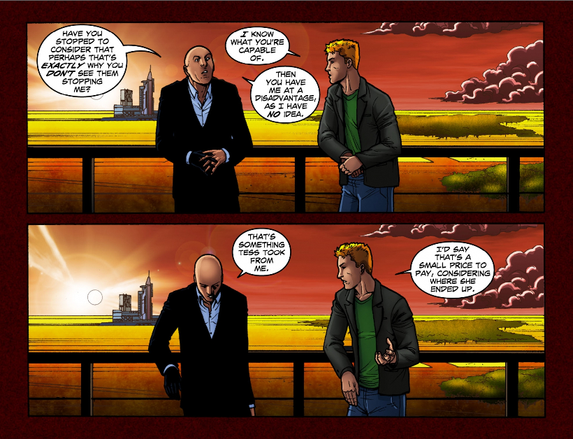 On the roof of LexCorp Plaza, Otis nervously confronts Lex with the results from his research, but Lex interrupts him, saying he wishes to savor the moment. Otis, confused, explains that the situation is terrible for LexCorp and questions his apparent cheerfulness. But Lex explains he has a good reason to be cheerful, stating he and Superman are about to have a very interesting conversation.