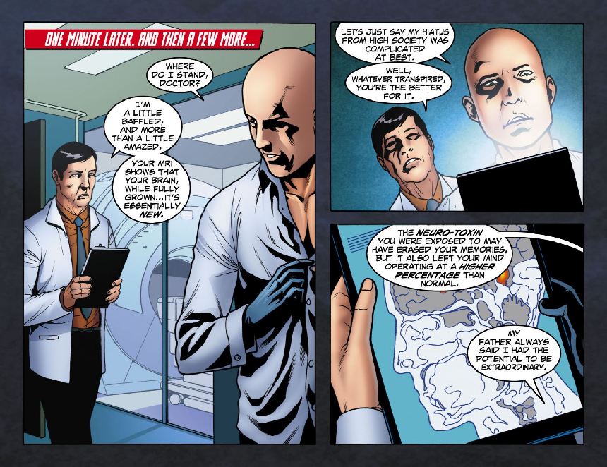 At Metropolis General Hospital, Lex Luthor undergoes an MRI to determine why he is seeing hallucinations of the deceased Tess Mercer. The doctor informs him that not only is his mind healthy but that it has been operating at a higher percentage since the neuro-toxin erased his memories. Without a physical reason, the doctor offers that learning that Tess committed suicide might have caused a psychological toll and suggests Lex consult with a therapist.