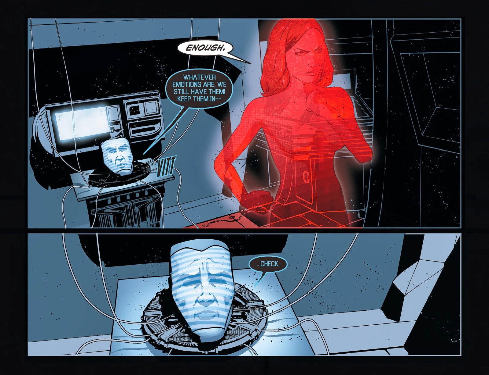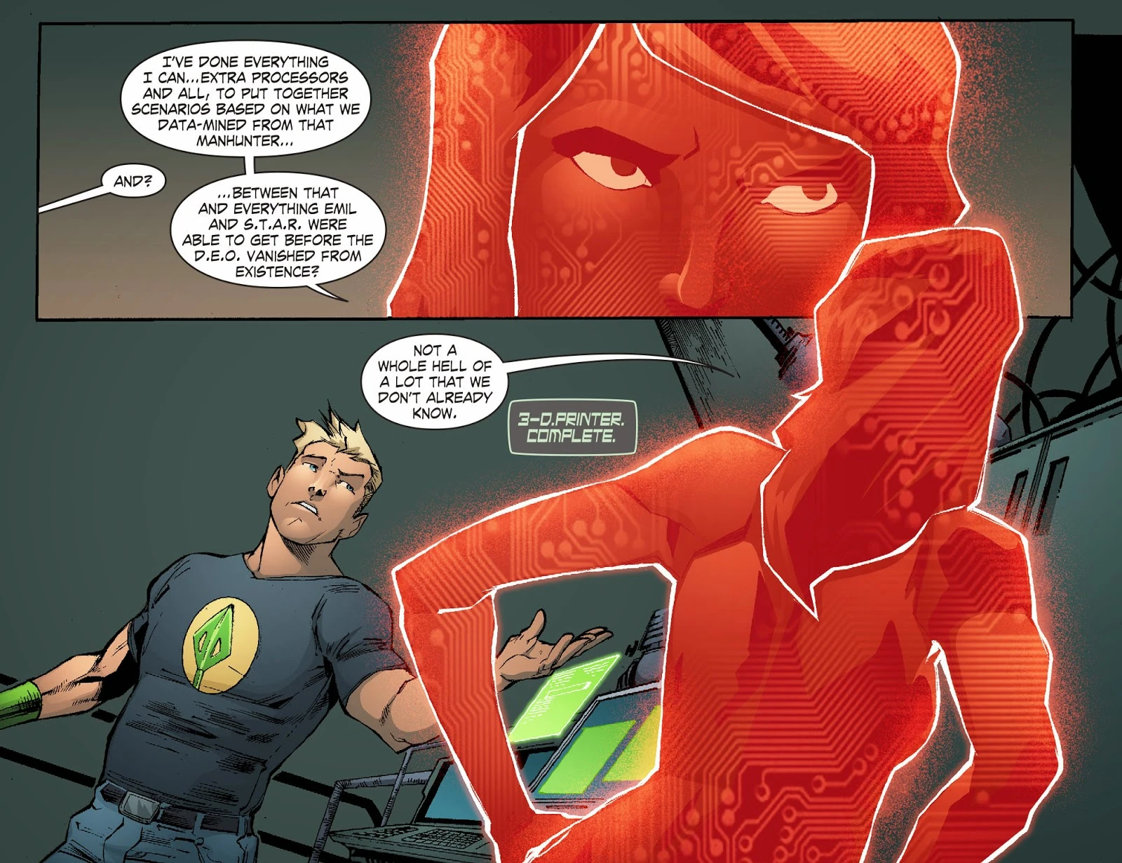 Even though Tess states that she doesn't have any feelings anymore, it is proven by Oliver that her statement is not actually very sincere. When she expresses her frustration on the fact she can not physically protect herself, take a stand against the Crisis and fight like she used to, Oliver says that she could easily create a body for herself with the 3D printer she has at her disposal for months now but the fact she hasn't done it so far means that she fears for something. Tess explains that if she becomes tactile again, that means she could die and lose everything but this time once and for all. Oliver recognizes Tess' response as a feeling, the fear of dying. (Continuity)