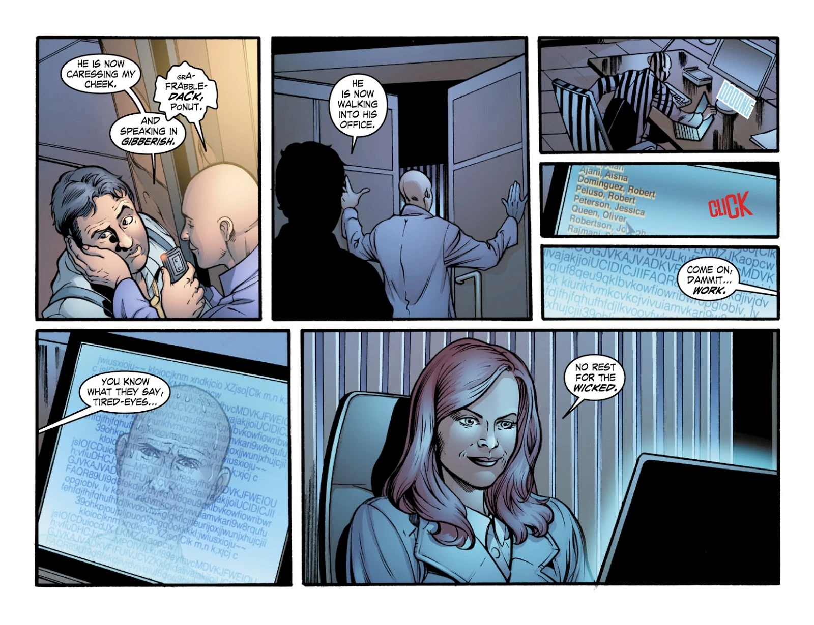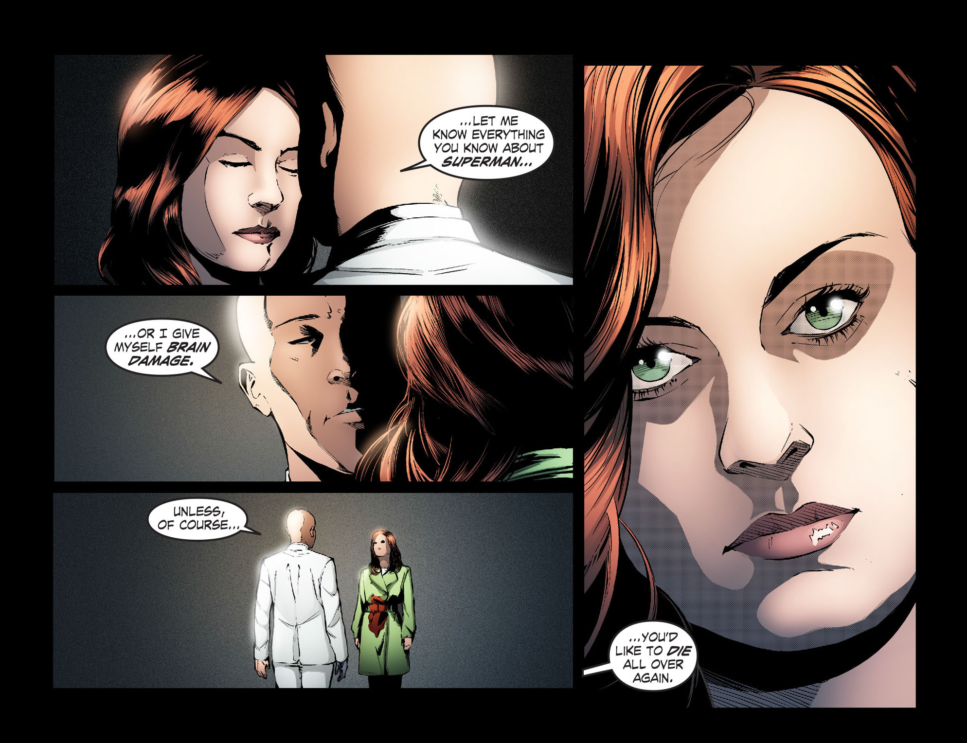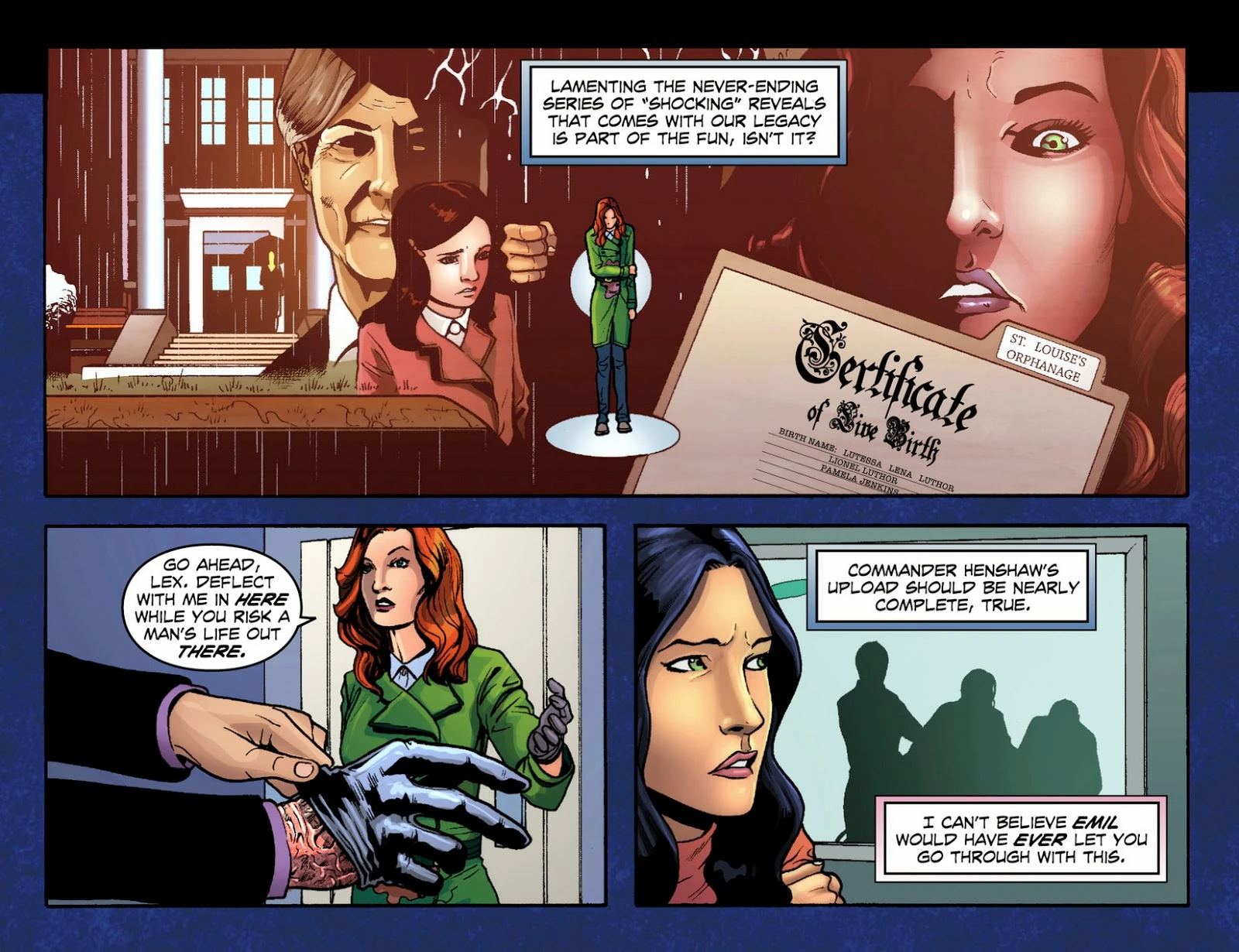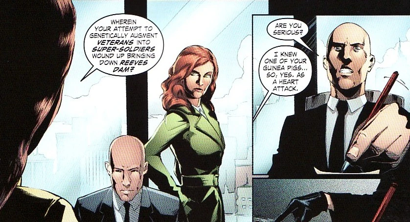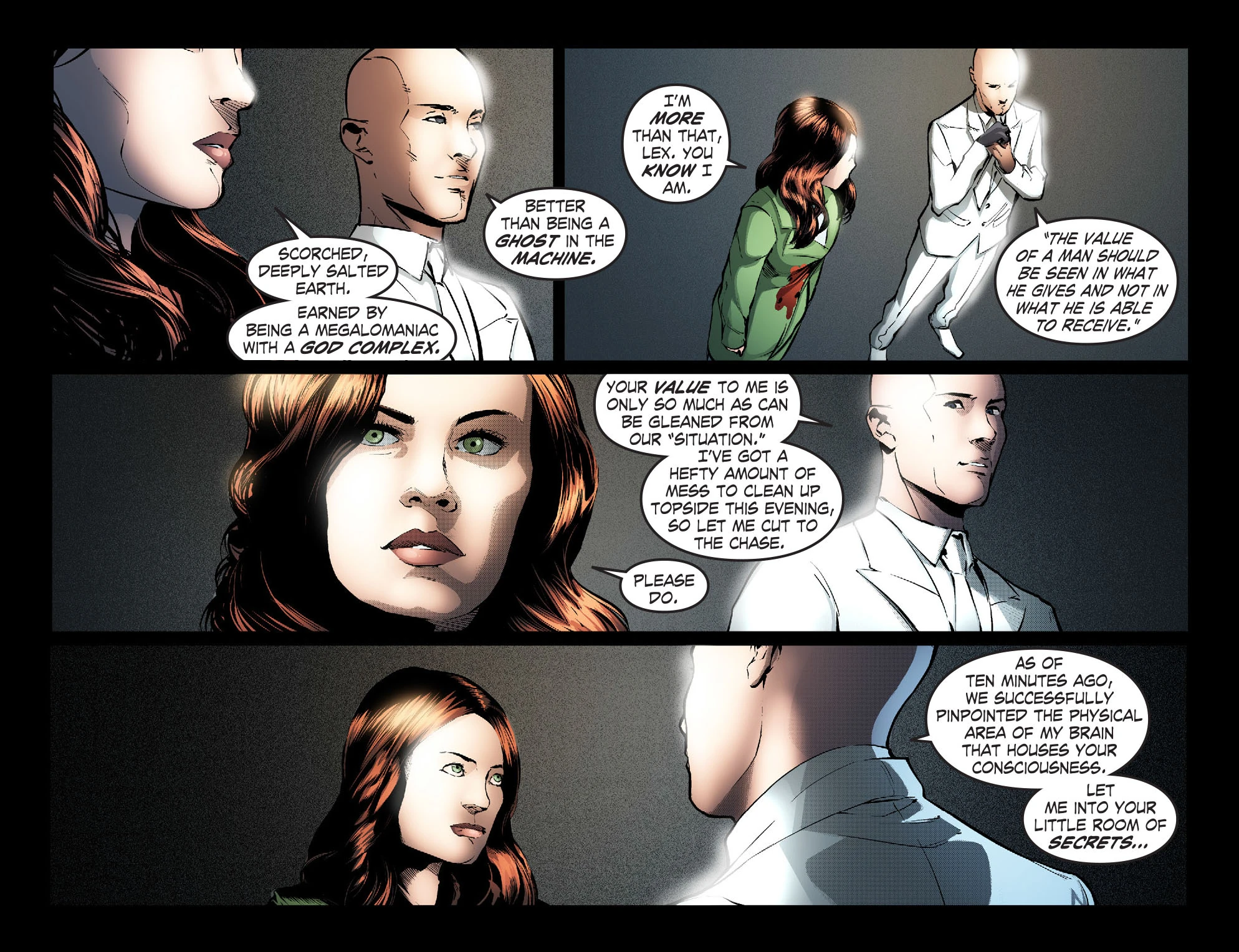 - ↑ She tells Lex in a mirror (while wearing ocular implants) that, "I did everything you ever asked. You've seen it with your own eyes, and apparently, with mine. But not anymore. I hope you watch with rapt attention as your bank accounts close, and you lose all contact with the outside world. I loved you, you son of a bitch."