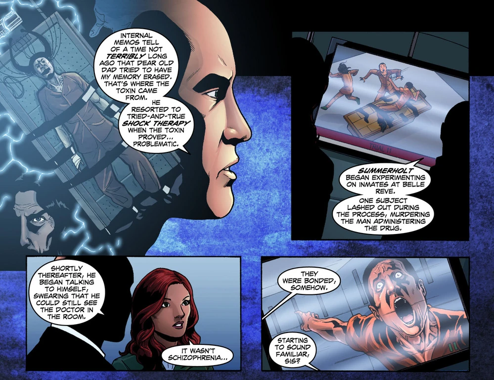 - ↑ She began her career as a marine biologist (Toxic), and also proposed building a solar tower to power Metropolis (Crossfire). She chose to side with Major Zod over humanity in the alternate future of Pandora, and told Oliver that she made the choice because "someone had to save the Earth. I couldn't give up on that."