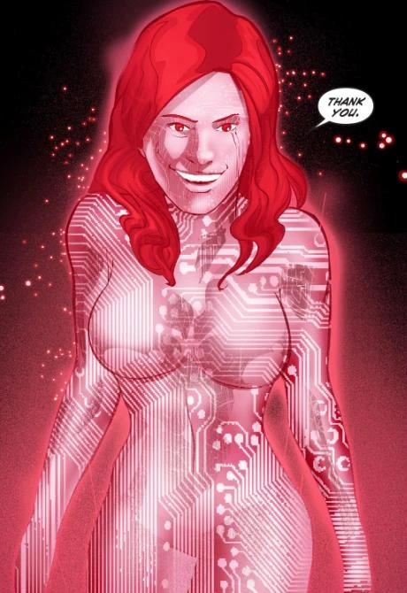 In her cyber form, Tess appears as an holographic mass of RAM's memory banks and binary codes which forms the red, nude, transparent ghost-like shape of her physique. While her hair and eyes are bright red, her skin seems light red, almost pink with some shades of white. Her whole body emits a bright red light and is surrounded by light particles similar to fireflies. (Haunted, Argo, Olympus, Hollow)
