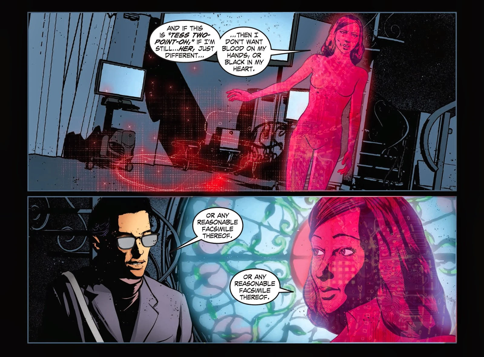 Even though Tess was grateful to her friends for freeing her from her brother's body, she was unsatisfied with her new state as an A.I. at first. She rejected Emil's offer to design a costume for her because, according to her, clothes are only for humans and she didn't considered herself as one anymore. Tess seemed to have distanced herself from her humanity and her life, focusing only on her work at the Watchtower and especially her revenge on Lex. She was overlooking any signs that proved she was still human, at least in part, like the fact that she was still able to dream, because of her frustration over Lex. Fortunately when she finally faced Lex she chose not to kill him, realizing that she still has feelings. She confessed to Emil Hamilton that the reason for not killing Lex was because of her dreams, stating that if she has dreams, it must means that she is not just a machine but more human than she previously thought. She then started seeing her current state as a second chance and not as a bad fortune, wanting to make the best of it and that is why she decided to finally accept Emil's offer. (Hollow)